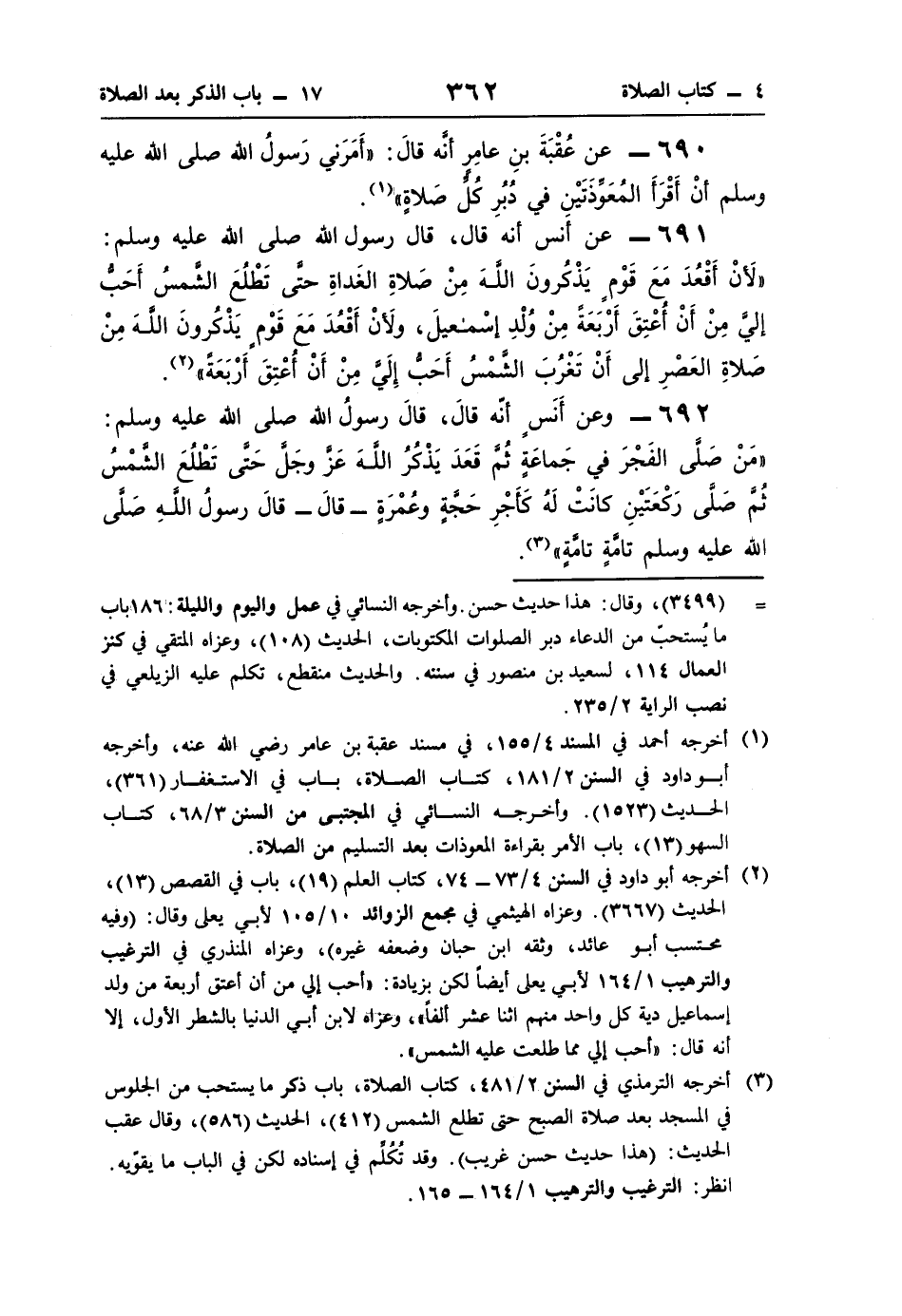 691 - عن أنس أنّه قال، قال رسول اللَّه صلى اللَّه عليه وسلم: "لَأنْ أَقْعُدَ مَعَ قَوْمٍ يَذْكُرونَ اللَّهَ مِنْ صَلاةِ الغَداةِ حتَّى تَطْلُعَ الشَّمسُ أَحَبُّ إليَّ مِنْ أَنْ أُعْتِقَ أَرْبَعَةً مِنْ وُلْدِ إسْمعيلَ، ولَأنْ أَقْعُدَ مَعَ قَوْمٍ يَذْكُرونَ اللَّهَ مِنْ صَلاةِ العَصْرِ إلى أَنْ تَغْرُبَ الشَّمْسُ أَحَبُّ إِلَيَّ مِنْ أَنْ أُعْتِقَ أَرْبَعَةً" (¬2).