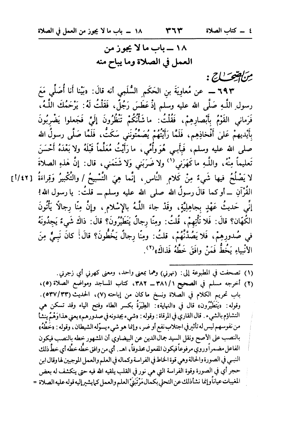 (¬2) أخرجه مسلم في الصحيح 1/ 381 - 382، كتاب المساجد ومواضع الصلاة (5)، باب تحريم الكلام في الصلاة ونسخ ما كان من إباحته (7)، الحديث (33/ 537). وقوله: "يَتَطَيَّرُون" قال في "النهاية": الطِيَرَةُ بكسر الطاء وفتح الياء وقد تسكن هي التشاؤم بالشيء. قال القاري في المرقاة: وقوله: "شيء يجدونه في صدورهم" يعني هذا وَهْمٌ ينشأ من نفوسهم ليس له تأثير في اجتلاب نفع أو ضر، وإنما هو شيء يسوّله الشيطان، وقوله: "خَطَّهُ" بالنصب على الأصح ونقل السيد جمال الدين عن البيضاوي أن المشهور خطه بالنصب فيكون الفاعل مضمرًا وروي مرفوعًا فيكون المفعول محذوفًا، اهـ. أي من وافق خطُّه خطَّه أي خطَّ ذلك النبي في الصورة والحالة وهي قوة الخاط في الفراسة وكماله في العلم والعمل الموجبين لها وقال ابن حجر أي في الصورة وقوة الفراسة التي هي نور في القلب يلقيه اللَّه فيه حتَّى ينكشف له بعض المغيبات عيانًا وإنما نشأ ذلك عن التحلي بكمال مَرْتَبَتَيْ العلم والعمل كما يشير إليه قوله عليه الصلاة =