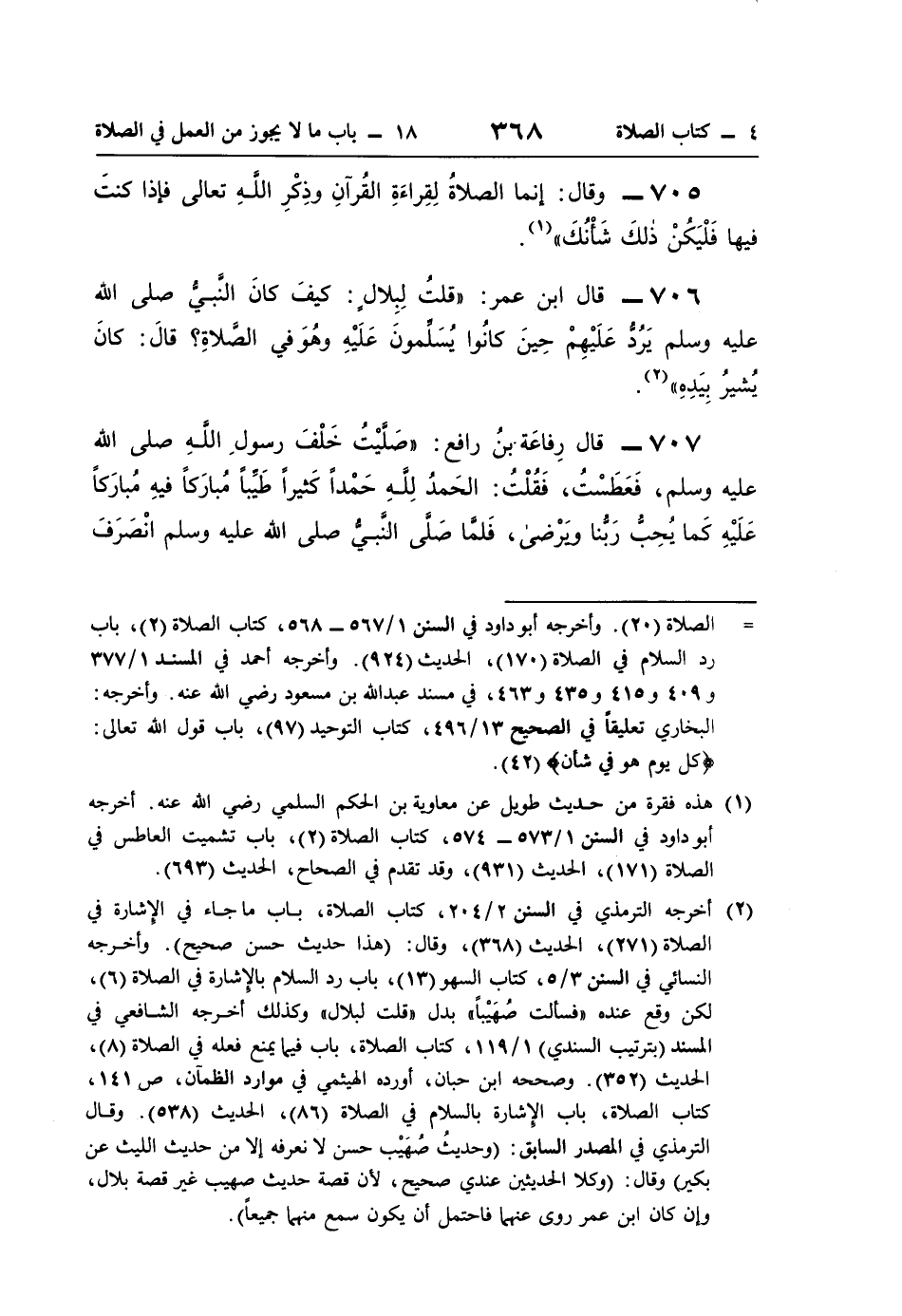 = الصلاة (20). وأخرجه أبو داود في السنن 1/ 567 - 568، كتاب الصلاة (2)، باب رد السلام في الصلاة (170)، الحديث (924). وأخرجه أحمد في المسند 1/ 377 و 409 و 415 و 435 و 463، في مسند عبد اللَّه بن مسعود رضي اللَّه عنه. وأخرجه: البخاري تعليقًا في الصحيح 13/ 496، كتاب التوحيد (97)، باب قول اللَّه تعالى: {كُلَّ يَوْمٍ هُوَ فِي شَأْنٍ} (42).
