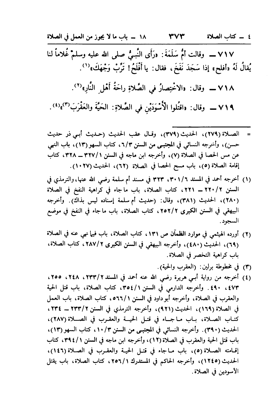 719 - وقال: "اقتُلوا الْأَسْوَدَيْنِ في الصَّلاةِ: الحَيَّةَ والعَقْرَبَ (¬3) " (¬4).
