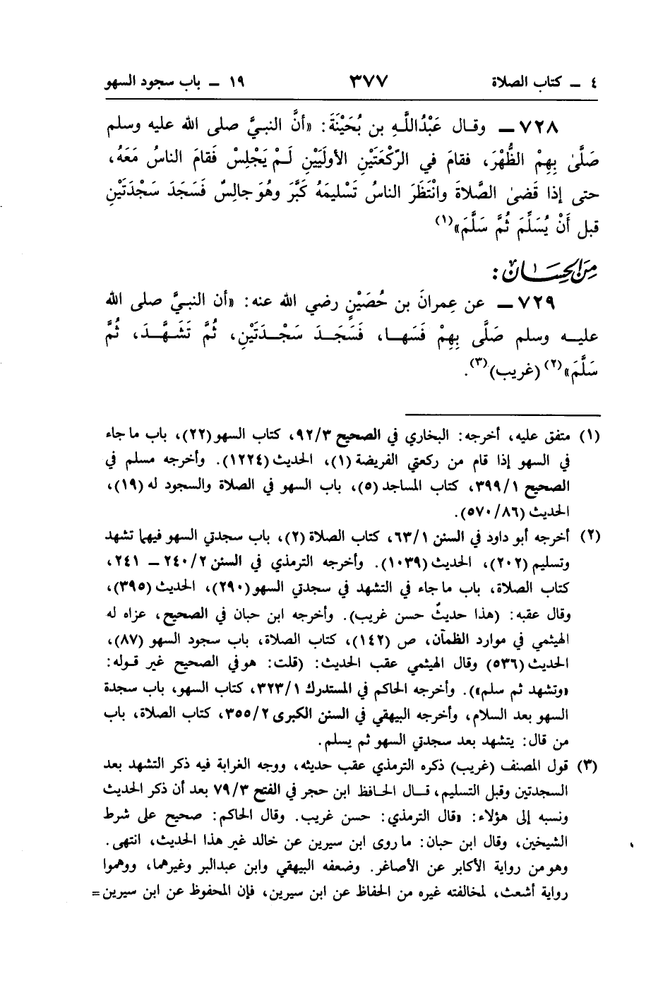 729 - عن عِمرانَ بن حُصَيْنٍ رضي اللَّه عنه: "أنَّ النبيَّ صلى اللَّه عليه وسلم صَلَّى بِهِمْ فَسَها، فَسَجَدَ سَجْدَتَيْنِ، ثُمَّ تَشَهَّدَ، ثُمَّ سَلَّمَ" (¬2) (غريب) (¬3).