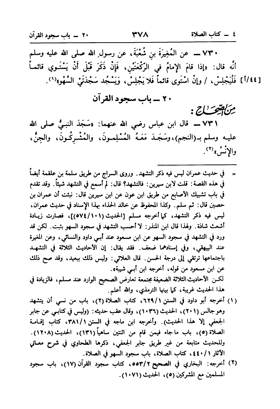 730 - عن المُغِيرَةَ بنِ شُعْبَةَ، عن رسولِ اللَّه صلى اللَّه عليه وسلم أنَّه قال: "إذا قامَ الإِمامُ في الرّكْعَتَيْنِ، فَإِنْ ذَكَرَ قَبْلَ أَنْ يَسْتَوي قائمًا فَلْيَجْلِسْ، وإنْ اسْتَوى قائمًا فَلا يَجْلِسْ، وَيَسْجُد سَجْدَتَيْ السَّهْو" (¬1).