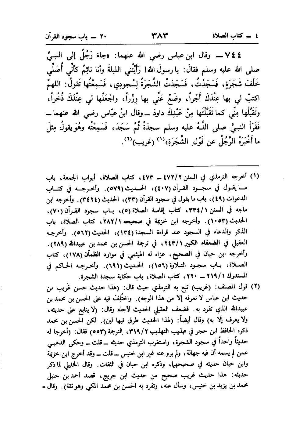744 - وقال ابن عباس رضي اللَّه عنهما: "جاءَ رَجُلٌ إلى النبيِّ صلى اللَّه عليه وسلم فقالَ: يا رسولَ اللَّه! رَأَيْتُني الليلةَ وأنا نائِمٌ كأنِّي أُصَلِّي خَلْفَ شَجَرَةٍ، فَسَجَدْتُ، فَسَجَدَتْ الشَّجَرَةُ لِسُجودِي، فَسَمِعْتُها تَقولُ: اللهمَّ اكتبْ لي بها عِنْدَكَ أَجْرًا، وضَعْ عَنِّي بها وِزْرًا، واجْعَلْها لي عِنْدَكَ ذُخْرًا، وتَقَبَّلْها مِنِّي كما تَقَبَّلْتَها مِنْ عَبْدِكَ داودَ -وقال ابنُ عبّاس رضي اللَّه عنهما- فَقَرَأَ النبيُّ صلى اللَّهُ عليه وسلم سجدَةً ثُمَّ سَجَدَ، فَسَمِعْتُه وهُوَ يقولُ مِثلَ ما أَخْبَرَهُ الرَّجُلُ عن قَوْلِ الشَّجَرَةِ" (¬1) (غريب) (¬2).