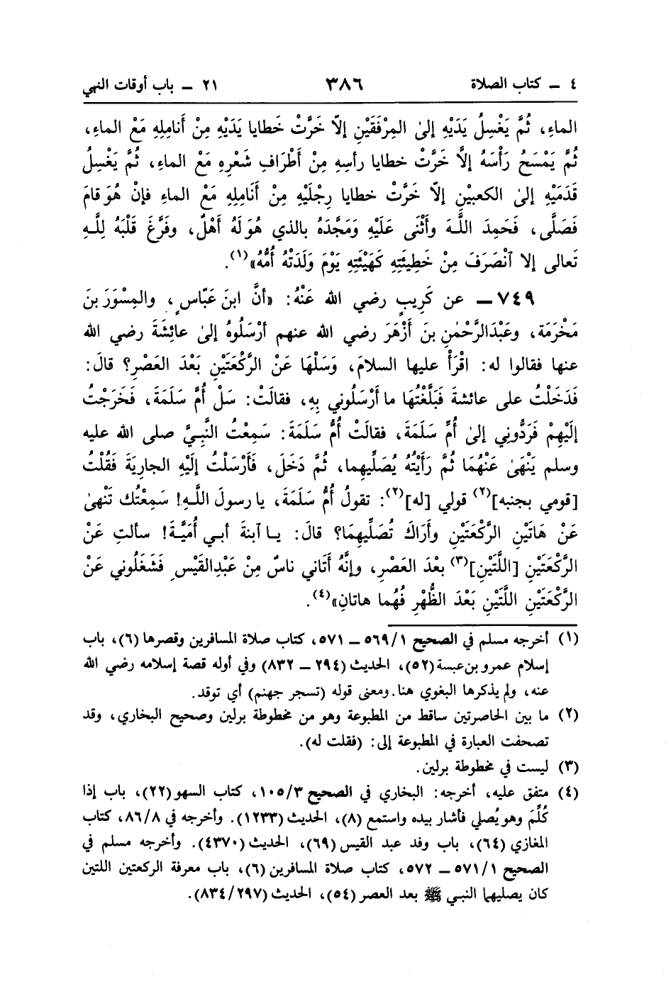 749 - عن كَرِيبٍ رضي اللَّه عَنْهُ: "أنَّ ابنَ عَبّاسٍ، والمِسْوَرَ بنَ مَخْرَمَة، وعَبْدَ الرَّحْمنِ بنَ أَزْهَرَ رضي اللَّه عنهم أرْسَلُوهُ إلى عائِشَةَ رضي اللَّه عنها فقالوا له: اقْرَأْ عليها السلامَ، وَسَلْهَا عَنْ الرَّكْعَتَيْنِ بَعْدَ العَصْرِ؟ قالَ: فَدَخَلْتُ على عائشةَ فَبَلَّغْتُهَا ما أَرْسَلُوني بِهِ، فقالَتْ: سَلْ أُمَّ سَلَمَةَ، فَخَرَجْتُ إلَيْهِمْ فَرَدُّونِي إلى أُمِّ سَلَمَةَ، فقالَتْ أُمُّ سَلَمَةَ: سَمِعْتُ النَّبِيَّ صلى اللَّه عليه وسلم يَنْهَى عَنْهُمَا ثُمَّ رَأَيْتُهُ يُصَلِّيهِما، ثُمَّ دَخَلَ، فَأَرْسَلْتُ إلَيْهِ الجارِيَةَ فَقُلْتُ [قومي بجنبه] (¬2) قولي [له] (2): تقولُ أُمُّ سَلَمَةَ، يا رسولَ اللَّهِ! سَمِعْتُك تَنْهى عَنْ هَاتَيْنِ الرَّكْعَتَيْنِ وأَرَاكَ تُصَلِّيهِمَا؟ قالَ: يا ابنةَ أبي أُمَيَّةَ! سألتِ عَنْ الرَّكْعَتَيْنِ [اللَّتَيْنِ] (¬3) بعْدَ العَصْرِ، وإنَّهُ أَتَاني ناسٌ مِنْ عَبْدِ القَيْسِ فَشَغَلُوني عَنْ الرَّكْعَتَيْنِ اللَّتَيْنِ بَعْدَ الظُّهْرِ فُهُما هاتانِ" (¬4).