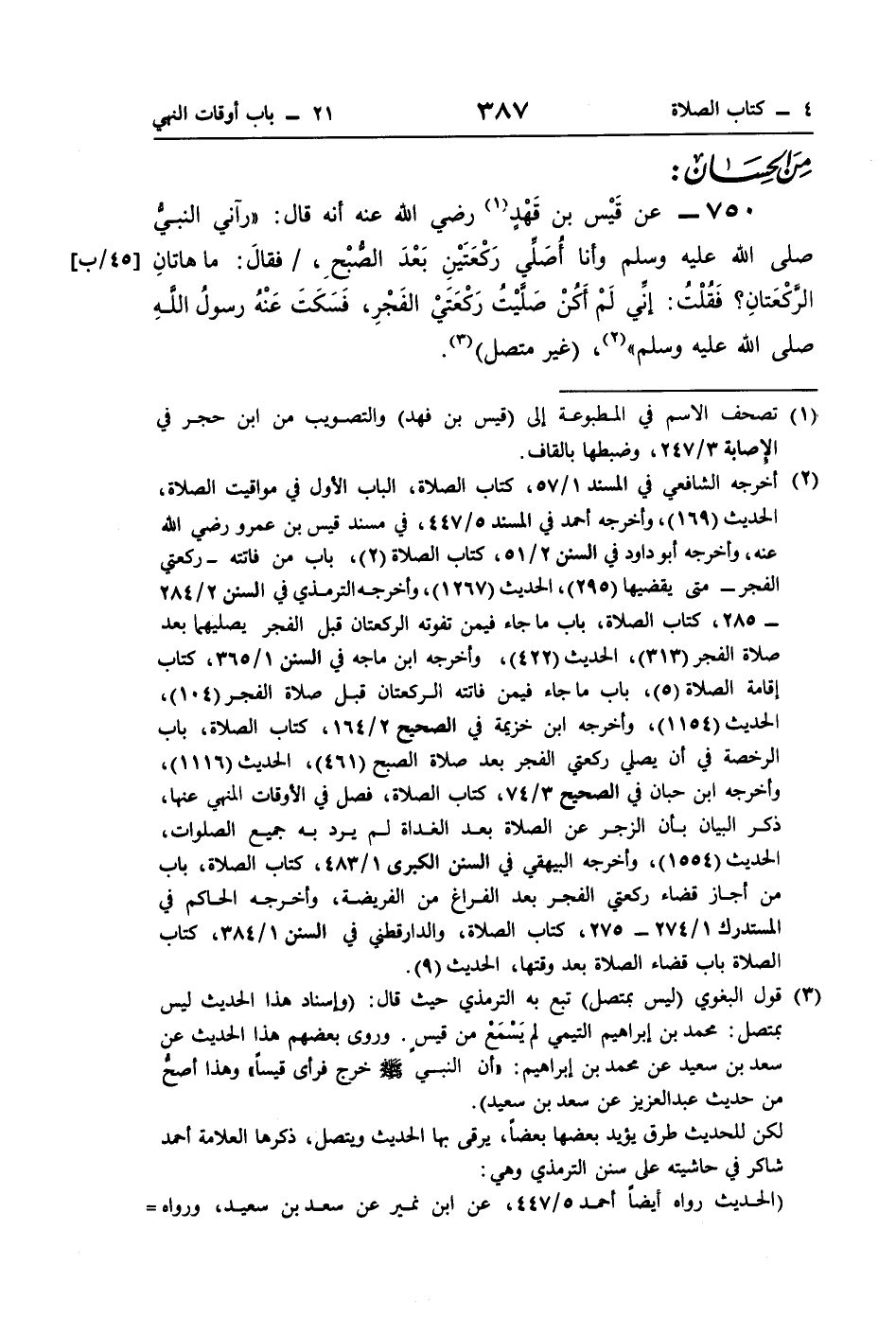 750 - عن قَيْس بن قَهْدٍ (¬1) رضي اللَّه عنه أنه قال: "رآني النبيُّ صلى اللَّه عليه وسلم وأنا أُصَلِّي رَكْعَتَيْنِ بَعْدَ الصُّبْحِ، فقالَ: ما هاتانِ الرَّكْعَتانِ؟ فَقُلْتُ: إنِّي لَمْ أَكُنْ صَلَّيْتُ رَكْعَتَيْ الفَجْرِ، فَسَكَتَ عَنْهُ رسولُ اللَّهِ صلى اللَّه عليه وسلم" (¬2)، (غير متصل) (¬3).