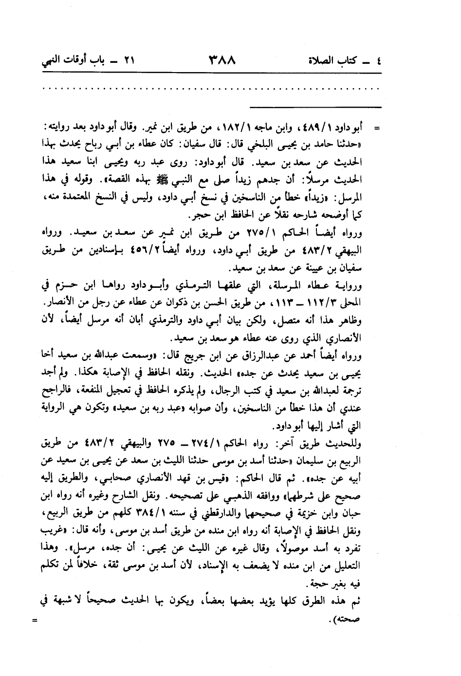 = أبو داود 1/ 489، وابن ماجه 1/ 182، من طريق ابن نمير. وقال أبو داود بعد روايته: "حدثنا حامد بن يحيى البلخي قال: قال سفيان: كان عطاء بن أبي رباح يحدث بهذا الحديث عن سعد بن سعيد. قال أبو داود: روى عبد ربه ويحيى ابنا سعيد هذا الحديث مرسلًا: أن جدهم زيدًا صلى مع النبي -صلى اللَّه عليه وسلم- بهذه القصة". وقوله في هذا المرسل: "زيدًا" خطأ من الناسخين في نسخ أبي داود، وليس في النسخ المعتمدة منه، كما أوضحه شارحه نقلًا عن الحافظ ابن حجر.