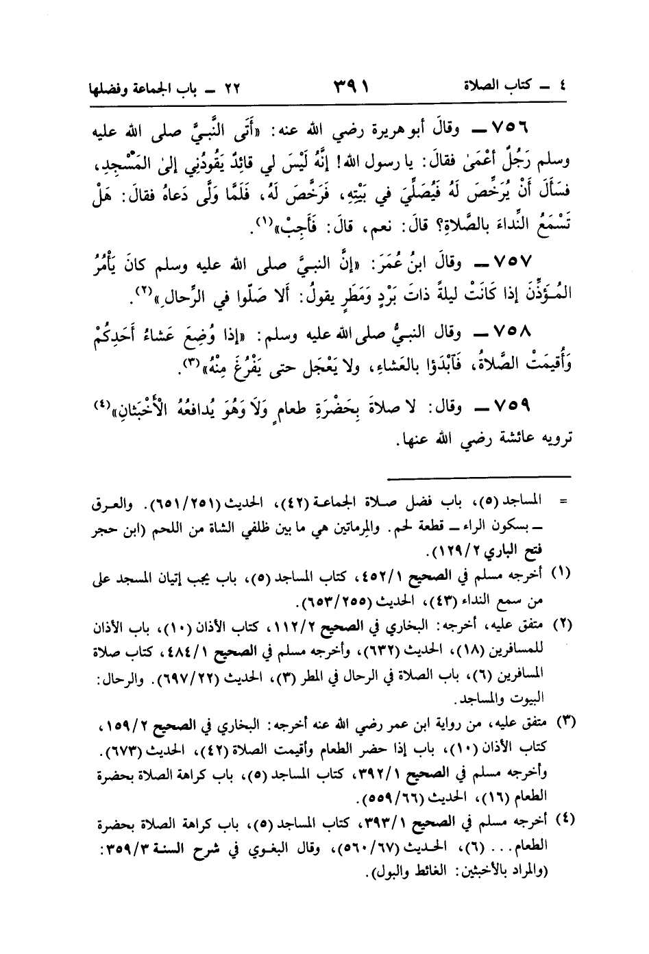 759 - وقال: لا صلاةَ بِحَضْرَةِ طعامٍ وَلاَ وَهُوَ يُدافعُهُ الْأَخْبَثانِ" (¬4) ترويه عائشة رضي اللَّه عنها.