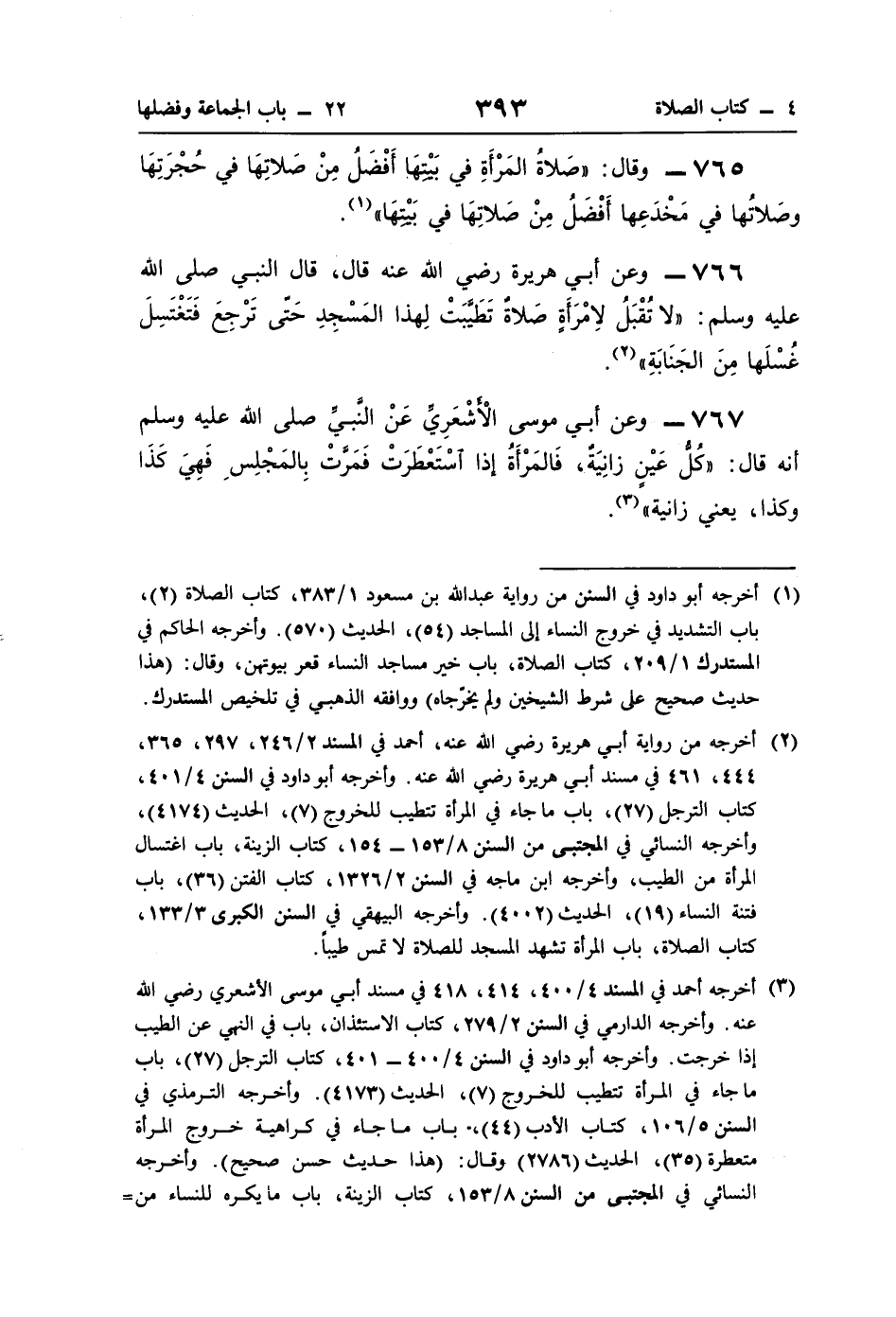 767 - وعن أبي موسى الْأَشْعَرِيِّ عَنْ النَّبيِّ صلى اللَّه عليه وسلم أنه قال: "كُلُّ عَيْنٍ زانِيَةٌ، فَالمَرْأَةُ إذا اسْتَعْطَرَتْ فَمَرَّتْ بِالمَجْلِسِ فَهِيَ كَذَا وكذا، يعني زانية" (¬3).