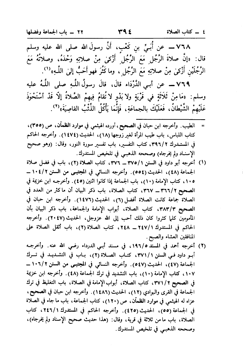 769 - عن أبي الدَّرْدَاء قالَ، قالَ رسولُ اللَّهِ صلى اللَّهُ عليه وسلم: "مَا مِنْ ثَلاَثَةٍ في قَرْيَةٍ ولا بَدْوٍ لا تُقامُ فِيهِمْ الصَّلاةُ إلّا قَدْ اسْتَحْوَذَ عَلَيْهِمْ الشَّيْطانُ، فَعَلَيْكَ بالجماعَةِ، فَإِنَّمَا يَأْكُلُ الذِّئْبُ القاصِيَةَ" (¬2).