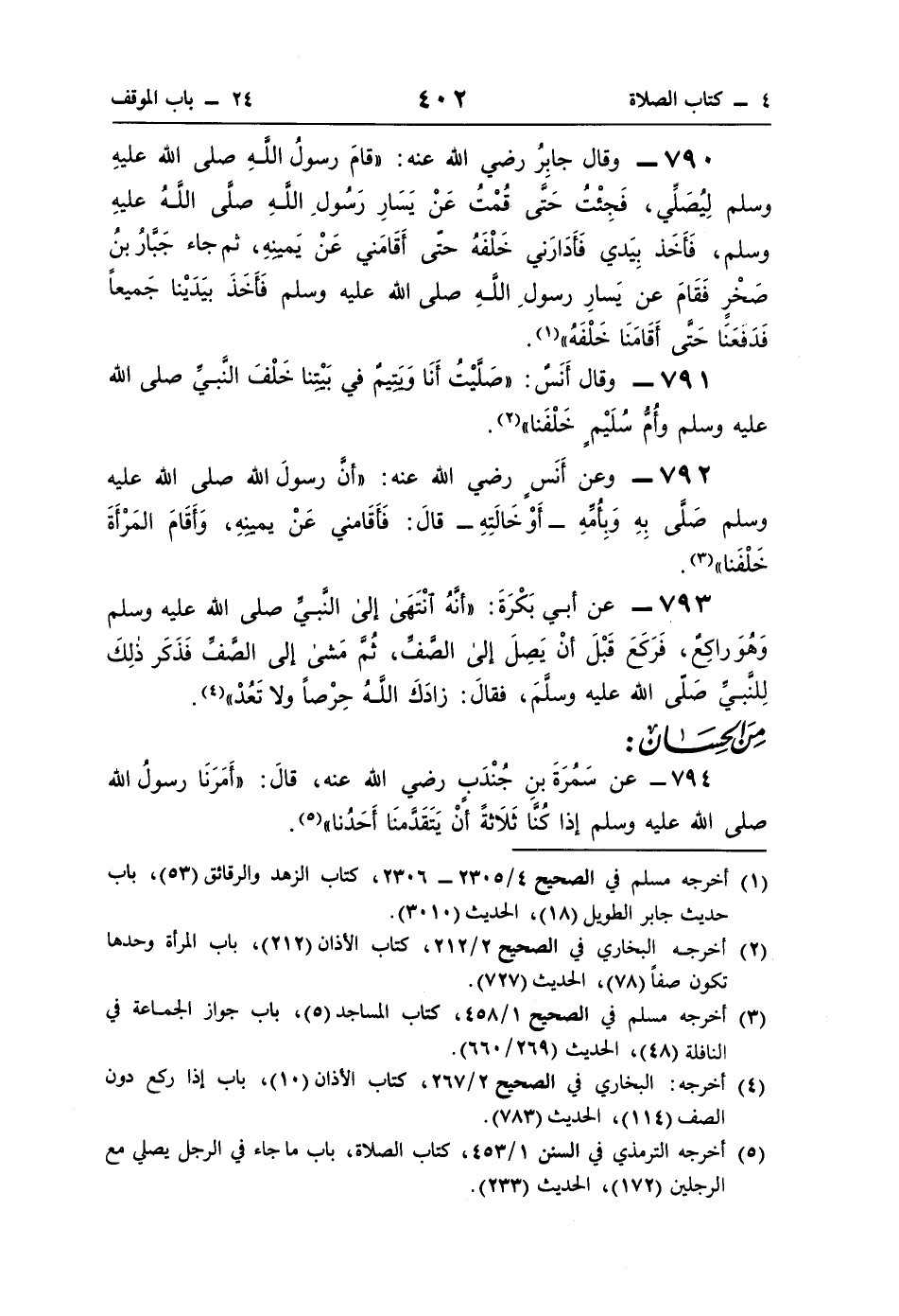 790 - وقال جابِرُ رضي اللَّه عنه: "قامَ رسولُ اللَّهِ صلَّى اللَّه عليهِ وسلم لِيُصَلِّي، فَجِئْتُ حَتَّى قُمْتُ عَنْ يَسَارِ رَسُولِ اللَّهِ صلَّى اللَّهُ عليهِ وسلم، فَأَخَذ بِيَدي فَأَدَارَني خَلْفَهُ حتَّى أَقَامَني عَنْ يَمينِهِ، ثمَّ جاء جَبَّارُ بنُ صَخْرٍ فَقَامَ عن يَسارِ رسولِ اللَّهِ صلى اللَّه عليه وسلم فَأَخَذ بيَدَيْنا جَميعًا فَدَفَعَنَا حَتَّى أَقَامَنَا خَلْفَهُ" (¬1).