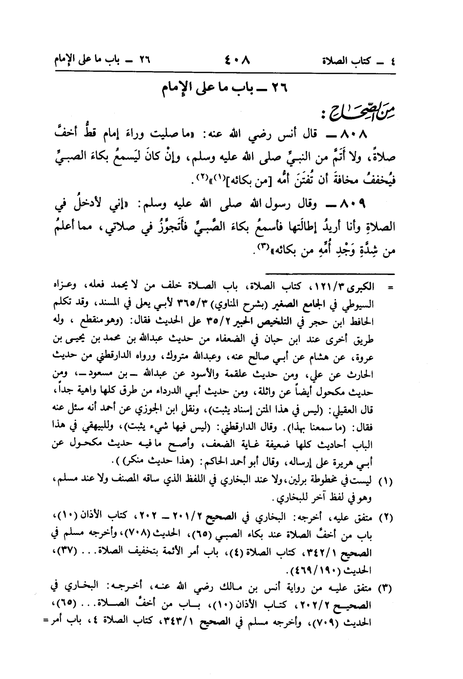 809 - وقال رسول اللَّه صلى اللَّه عليه وسلم: "إني لأدخلُ في الصلاةِ وأنا أريدُ إِطالَتها فأسمعُ بكاءَ الصَّبي فأَتَجوَّزُ في صلاتي، مما أعلمُ من شِدَّةِ وَجْدِ أُمِّهِ من بكائه" (¬3).