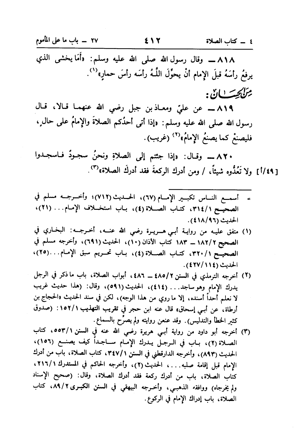 818 - وقال رسول اللَّه صلى اللَّه عليه وسلم: "أَمَا يخشى الذي يرفعُ رأسَهُ قبلَ الإمام أنْ يحوِّلَ اللَّهُ رأسَه رأسَ حمارٍ" (¬1).