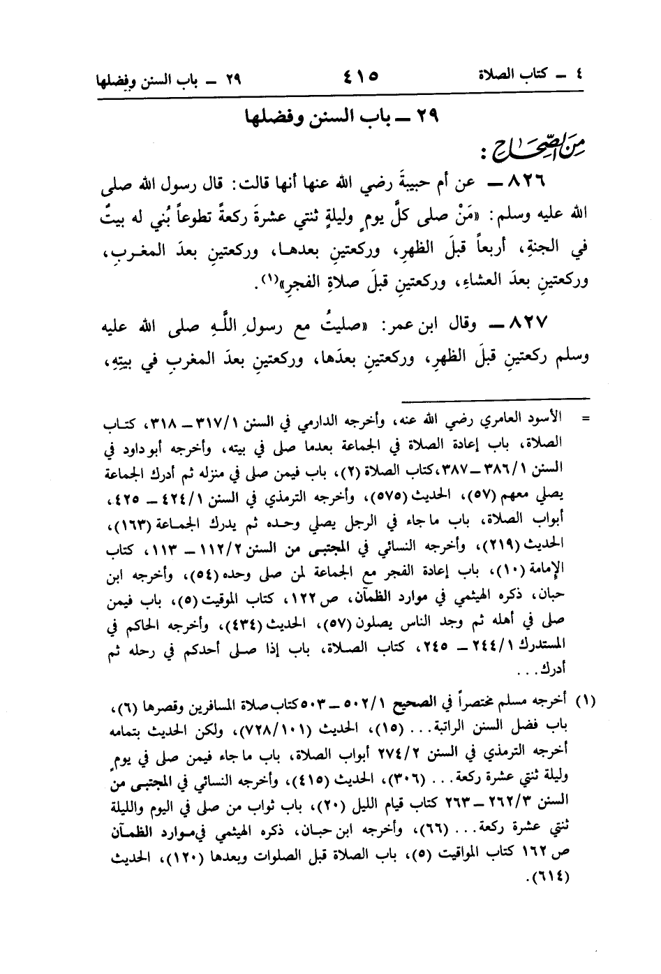 826 - عن أم حبيبةَ رضي اللَّه عنها أنها قالت: قال رسول اللَّه صلى اللَّه عليه وسلم: "مَنْ صلى كلَّ يومٍ وليلةٍ ثنتي عشرةَ ركعةً تطوعًا بُني له بيتٌ في الجنّةِ، أربعًا قبلَ الظهرِ، وركعتينِ بعدها، وركعتينِ بعدَ المغربِ، وركعتينِ بعدَ العشاءِ، وركعتينِ قبلَ صلاةِ الفجرِ" (¬1).
