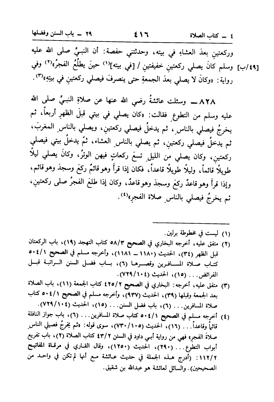 828 - وسئلت عائشةُ رضي اللَّه عنها عن صلاةِ النبيِّ صلى اللَّه عليه وسلم من التطوعِ فقالت: "كان يصلي في بيتي قبلَ الظهرِ أربعًا، ثمَّ يخرجُ فيصلي بالناسِ، ثمَّ يدخلُ فيصلي ركعتينِ، ويصلي بالناسِ المغربَ، ثم يدخلُ فيصلي ركعتينِ، ثمَّ يصلي بالناسِ العشاء، ثمَّ يدخلُ بيتي فيصلي ركعتينِ، وكان يصلي من الليلِ تسعَ ركعاتٍ فيهن الوترُ، وكانَ يصلي ليلًا طويلًا قائمًا، وليلًا طويلًا قاعدًا، فكان إذا قرأَ وهو قائمٌ ركعَ وسجدَ وهو قائم، وإذا قرأَ وهو قاعدٌ ركعَ وسجدَ وهو قاعدٌ، وكان إذا طلعَ الفجرُ صلى ركعتينِ، ثم يخرجُ فيصلي بالناسِ صلاة الفجرِ" (¬4).