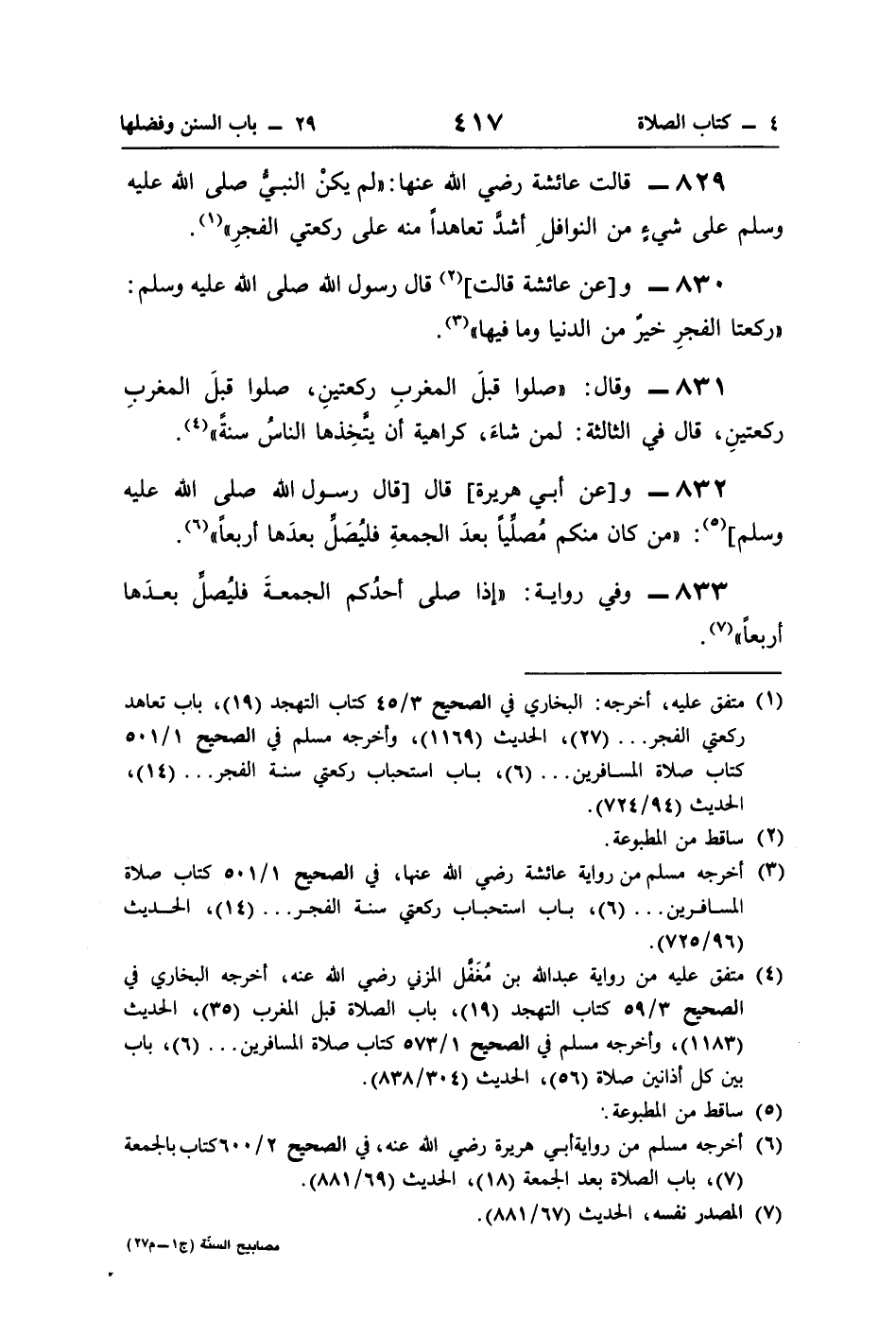 833 - وفي رواية: "إذا صلى أحدُكم الجمعةَ فليُصلِّ بعدَها أربعًا" (¬7).