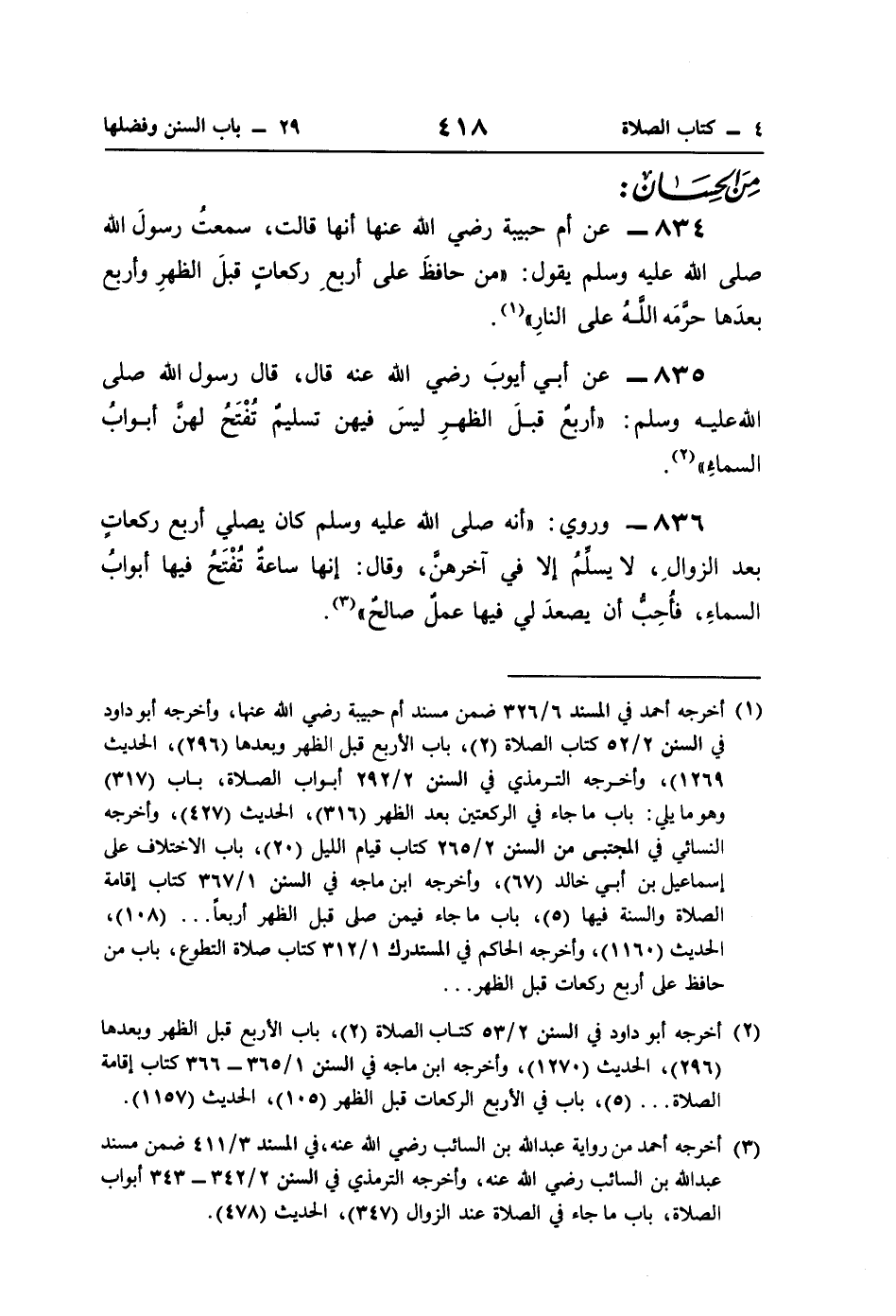 835 - عن أبي أيوبَ رضي اللَّه عنه قال، قال رسول اللَّه صلى اللَّه عليه وسلم: "أربعٌ قبلَ الظهرِ ليسَ فيهن تسليمٌ تُفْتَحُ لهنَّ أبوابُ السماءِ" (¬2).