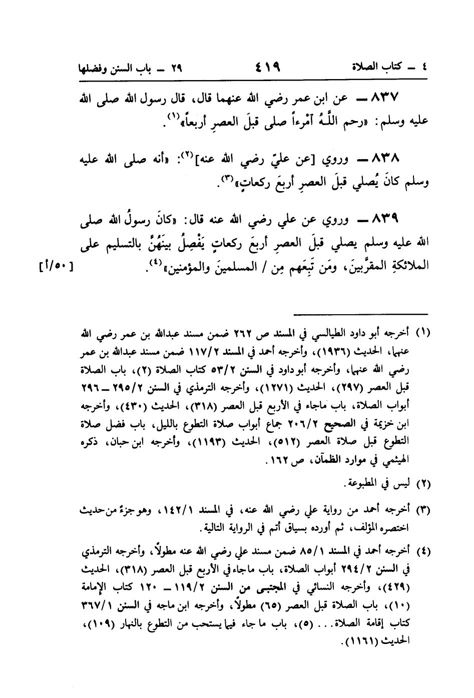 837 - عن ابن عمر رضي اللَّه عنهما قال، قال رسول اللَّه صلى اللَّه عليه وسلم: "رحم اللَّهُ أمْرءًا صلى قبلَ العصرِ أربعًا" (¬1).