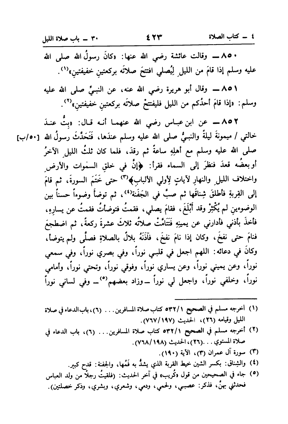 852 - عن ابن عباس رضي اللَّه عنهما أنَّه قال: "بِتُّ عندَ خالتي ميمونةَ ليلةً والنبيُّ صلى اللَّه عليه وسلم عندَها، فَتَحَدَّثَ رسولُ اللَّه صلى اللَّه عليه وسلم مع أهلِهِ ساعةً ثم رقدَ، فلما كان ثلثُ الليلِ الآخرُ أو بعضُه قعدَ فنظرَ التي السماء فقرأ: {إِنَّ فِي خَلْقِ السَّمَاوَاتِ وَالْأَرْضِ وَاخْتِلَافِ اللَّيْلِ وَالنَّهَارِ لَآيَاتٍ لِأُولِي الْأَلْبَابِ} (¬3) حتَّى خَتَمَ السورةَ، ثمَّ قامَ إلى القِربةِ فأطلقَ شِناقَها ثم صبَّ في الجَفَنة (¬4)، ثمَّ توضأ وضوءًا حسنًا بين الوضوءينِ لم يُكْثِرْ وقد أَبْلَغَ، فقامَ يصلي، فقمتُ فتوضأتُ فقمتُ عن يسارِهِ، فأخذَ بأذني فأدارني عن يمينِهِ فَتَتَامَّتْ صلاتُه ثلاثَ عشرةَ ركعةً، ثمَّ اضطجعَ فنامَ حتَّى نفخَ، وكان إذا نامَ نفخَ، فآذَنَهُ بلالٌ بالصلاةِ فصلَّى ولم يتوضّأ، وكانَ في دعائه: اللهم اجعل في قلبي نورًا، وفي بصري نورًا، وفي سمعي نورًا، وعن يميني نورًا، وعن يساري نورًا، وفوقي نورًا، وتحتي نورًا، وأمامي نورًا، وخلفي نورًا، واجعل لي نورًا -وزاد بعضهم (¬5) - وفي لساني نورًا