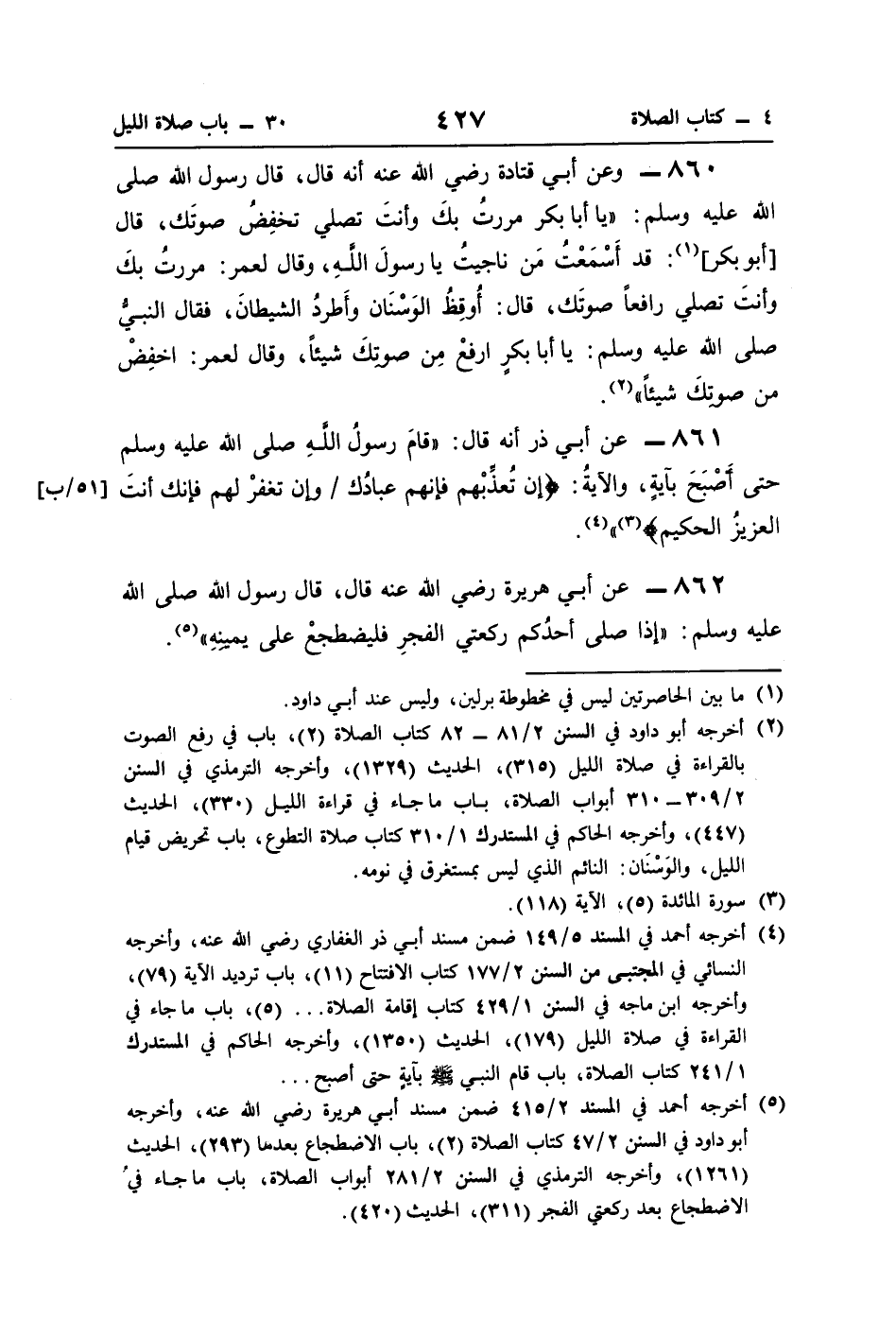 861 - عن أبي ذر أنَّه قال: "قامَ رسولُ اللَّهِ صلى اللَّه عليه وسلم حتَّى أَصْبَحَ بآيةٍ، والآيةُ: {إِنْ تُعَذِّبْهُمْ فَإِنَّهُمْ عِبَادُكَ وَإِنْ تَغْفِرْ لَهُمْ فَإِنَّكَ أَنْتَ الْعَزِيزُ الْحَكِيمُ} (¬3) " (¬4).