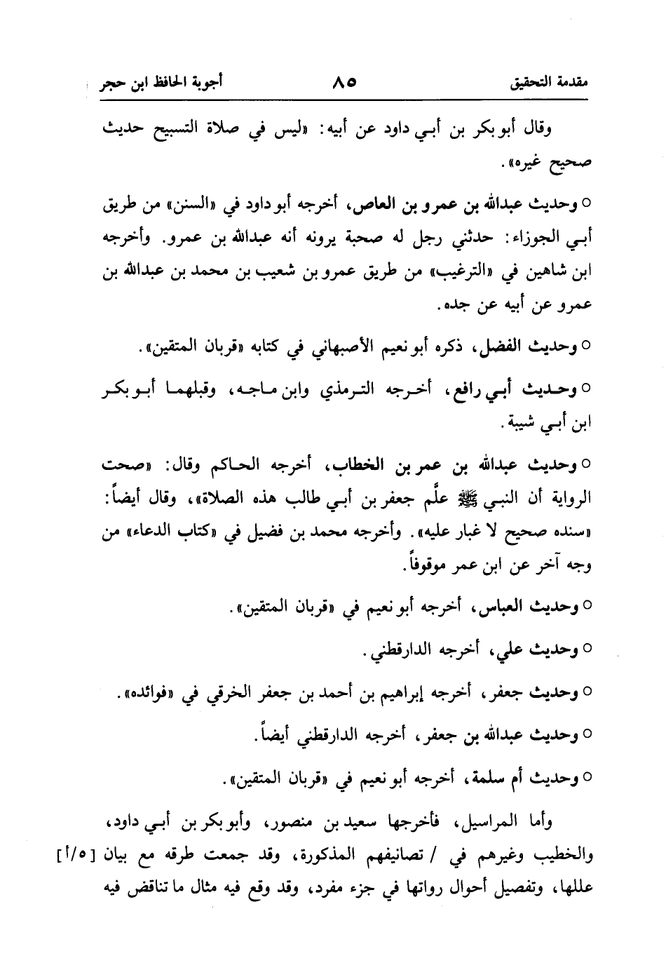 ° وحديث عبد اللَّه بن عمر بن الخطاب، أخرجه الحاكم وقال: "صحت الرواية أن النبي -صلى اللَّه عليه وسلم- علَّم جعفر بن أبي طالب هذه الصلاة"، وقال أيضًا: "سنده صحيح لا غبار عليه". وأخرجه محمد بن فضيل في "كتاب الدعاء" من وجه آخر عن ابن عمر موقوفًا.