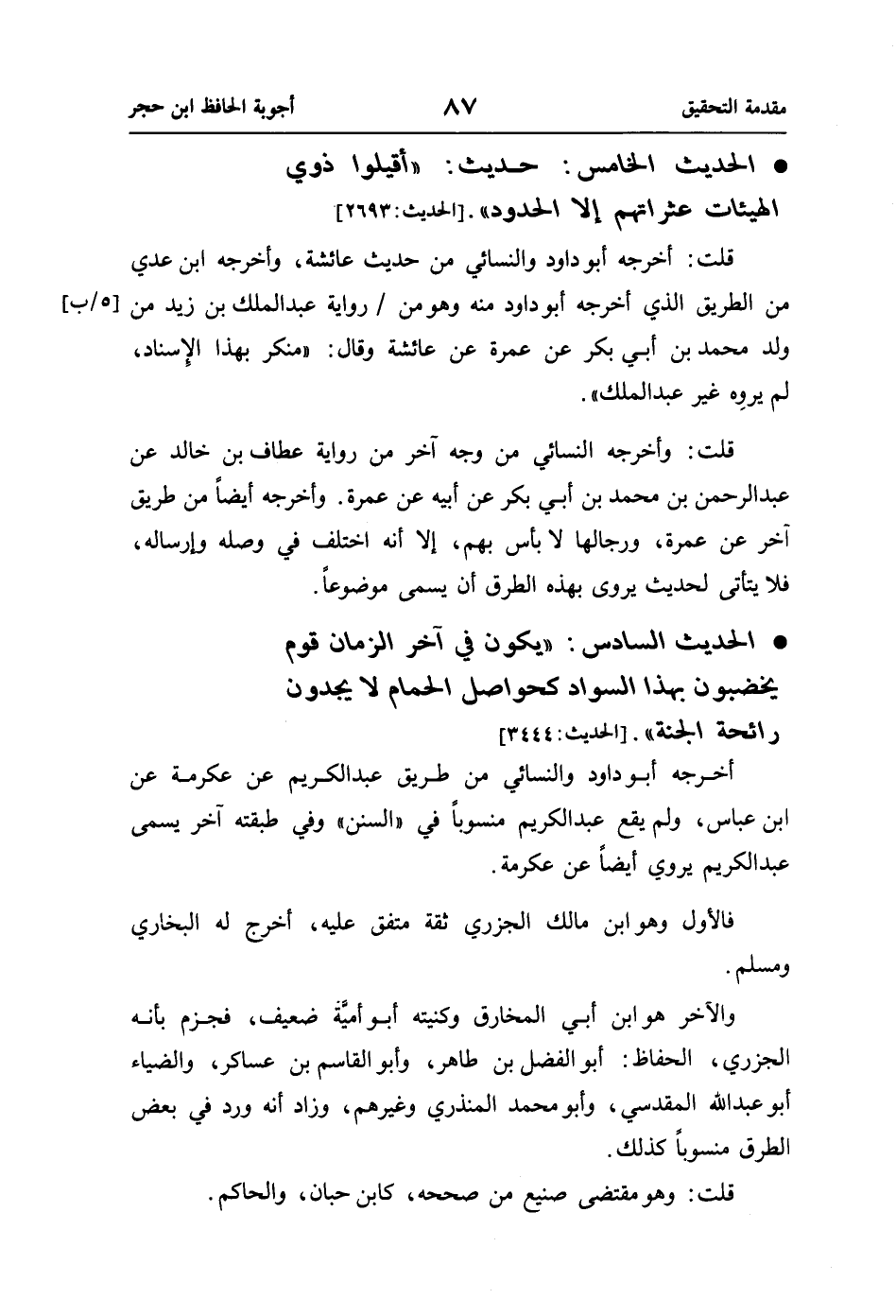 • الحديث الخامس: حديث: "أقيلوا ذوي الهيئات عثراتهم إلا الحدود". [الحديث: 2693]