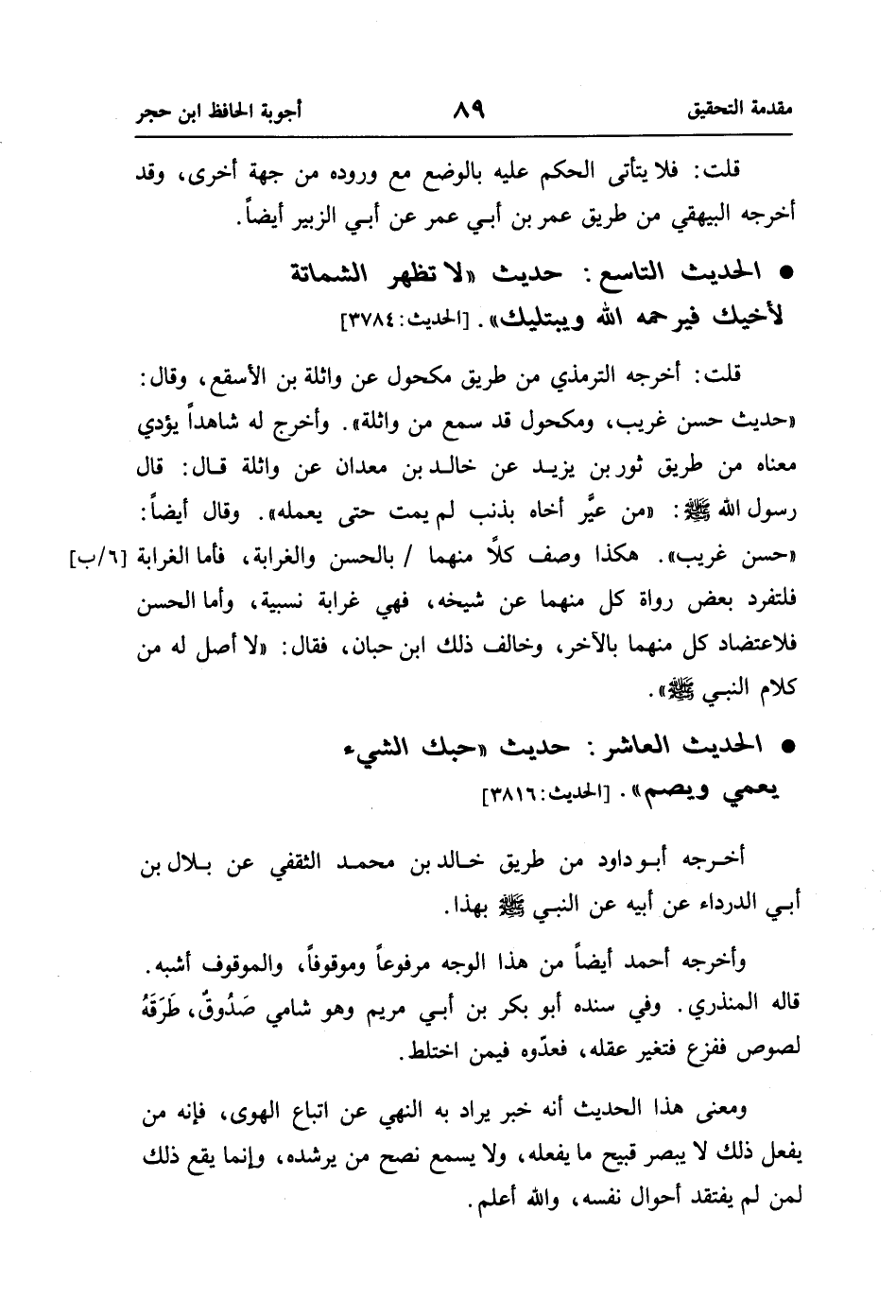• الحديث التاسع: حديث "لا تظهر الشماتة لأخيك فيرحمه اللَّه ويبتليك". [الحديث: 3784]