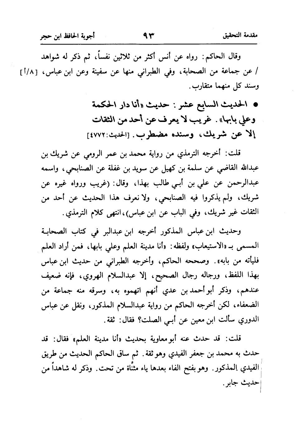 • الحديث السابع عشر: حديث "أنا دار الحكمة وعلي بابها". غريب لا يعرف عن أحد من الثقات إلا عن شريك، وسنده مضطرب. [الحديث: 4772]