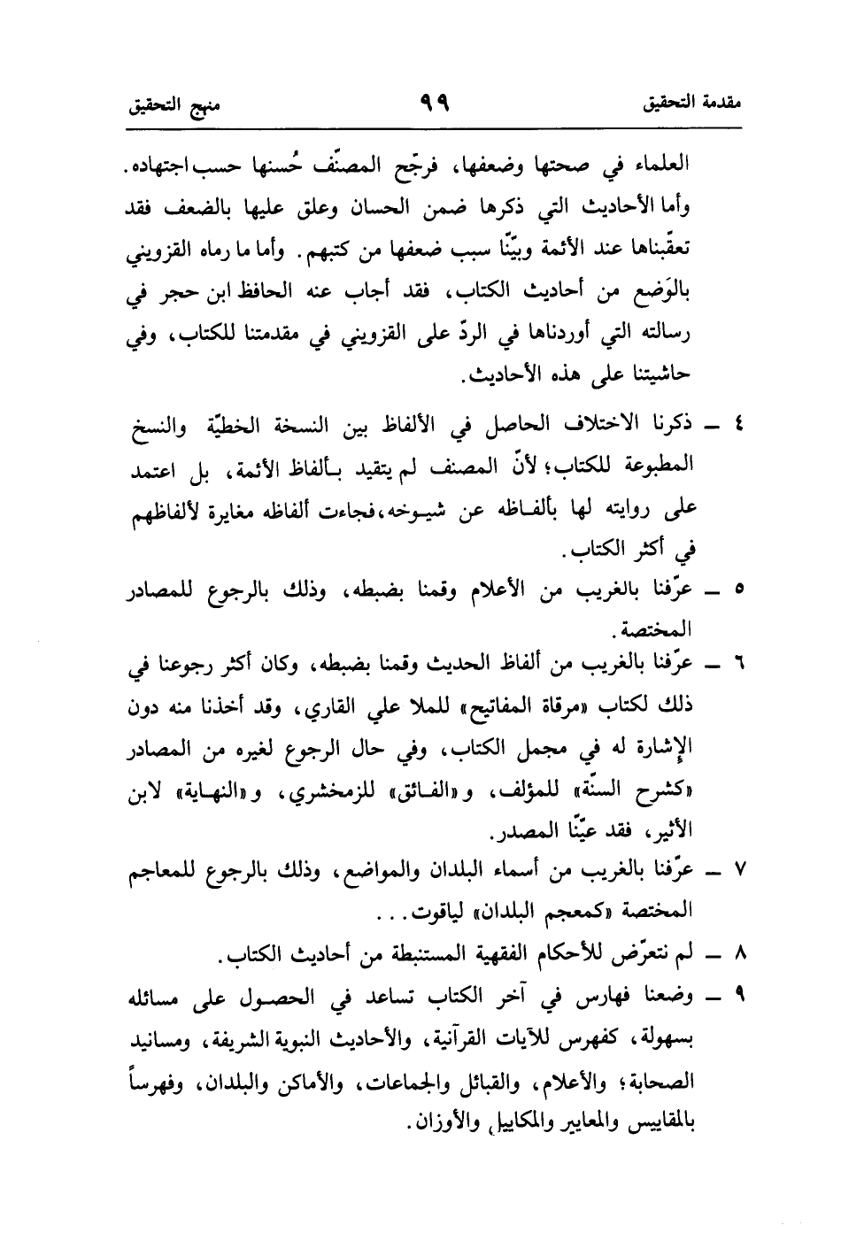 9 - وضعنا فهارس في آخر الكتاب تساعد في الحصول على مسائله بسهولة، كفهرس للآيات القرآنية، والأحاديث النبوية الشريفة، ومسانيد الصحابة؛ والأعلام، والقبائل والجماعات، والأماكن والبلدان، وفهرسًا بالمقاييس والمعايير والمكاييل والأوزان.