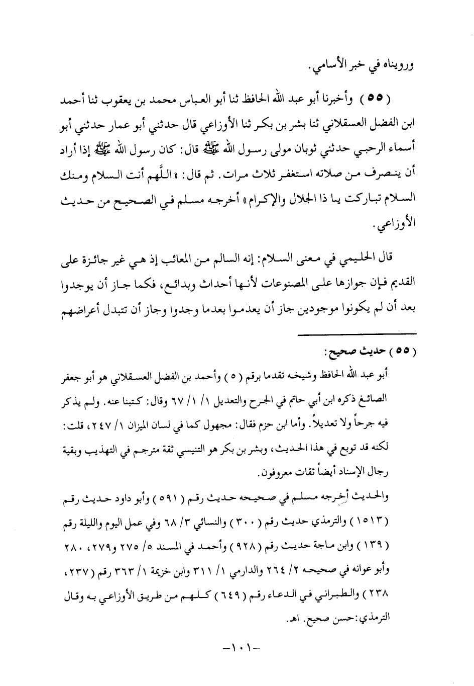 55 - وَأَخْبَرَنَا أَبُو عَبْدِ اللَّهِ الْحَافِظُ , ثنا أَبُو الْعَبَّاسِ مُحَمَّدُ بْنُ يَعْقُوبَ , ثنا أَحْمَدُ بْنُ الْفَضْلِ الْعَسْقَلَانِيُّ , ثنا بِشْرُ بْنُ بَكْرٍ , ثنا الْأَوْزَاعِيُّ , قَالَ: حَدَّثَنِي أَبُو عَمَّارٍ , حَدَّثَنِي أَبُو أَسْمَاءَ الرَّحَبِيُّ , حَدَّثَنِي ثَوْبَانُ , مَوْلَى رَسُولِ اللَّهِ صَلَّى اللهُ عَلَيْهِ وَسَلَّمَ قَالَ: كَانَ رَسُولُ اللَّهِ صَلَّى اللهُ عَلَيْهِ وَسَلَّمَ §إِذَا أَرَادَ أَنْ يَنْصَرِفَ مِنْ صَلَاتِهِ اسْتَغْفَرَ ثَلَاثَ مَرَّاتٍ ثُمَّ قَالَ: «اللَّهُمَّ أَنْتَ السَّلَامُ وَمِنْكَ السَّلَامُ تَبَارَكْتَ يَا ذَا الْجَلَالِ وَالْإِكْرَامِ» أَخْرَجَهُ مُسْلِمٌ فِي الصَّحِيحِ مِنْ حَدِيثِ الْأَوْزَاعِيِّ قَالَ الْحَلِيمِيُّ فِي مَعْنَى السَّلَامِ: إِنَّهُ السَّالِمُ مِنَ الْمَعَائِبِ إِذْ هِيَ غَيْرُ جَائِزَةٍ عَلَى الْقَدِيمِ فَإِنَّ جَوَازَهَا عَلَى الْمَصْنُوعَاتِ لِأَنَّهَا أَحْدَاثٌ وَبَدَائِعُ , فَكَمَا جَازَ أَنْ يُوجَدُوا بَعْدَ أَنْ لَمْ يَكُونُوا مَوْجُودِينَ جَازَ أَنْ يُعْدَمُوا بَعْدَمَا وُجِدُوا وَجَازَ أَنْ تَتَبَدَّلَ أَعْرَاضُهُمْ -[102]- وَتَتَنَاقَصَ أَوْ تَتَزَايَدَ أَجْزَاؤُهُمْ , وَالْقَدِيمُ لَا عِلَّةَ لِوُجُودِهِ فَلَا يَجُوزُ التَّغَيُّرُ عَلَيْهِ وَلَا يُمْكِنُ أَنْ يُعَارِضَهُ نَقْصٌ أَوْ شَيْنٌ , أَوْ تَكُونَ لَهُ صِفَةٌ تُخَالِفُ الْفَضْلَ وَالْكَمَالَ وَقَالَ الْخَطَّابِيُّ: وَقِيلَ السَّلَامُ هُوَ الَّذِي سَلَّمَ الْخَلْقَ مِنْ ظُلْمِهِ وَمِنْهَا «الْغَنِيُّ» قَالَ اللَّهُ عَزَّ وَجَلَّ: {وَاللَّهُ الْغَنِيُّ وَأَنْتُمُ الْفُقَرَاءُ} [محمد: 38] وَرُوِّينَاهُ فِي خَبَرِ الْأَسَامِي