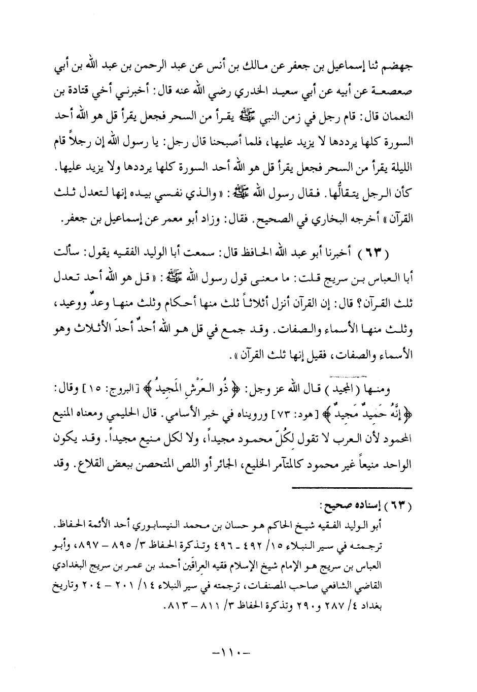 63 - أَخْبَرَنَا أَبُو عَبْدِ اللَّهِ الْحَافِظُ , قَالَ: سَمِعْتُ أَبَا الْوَلِيدِ الْفَقِيهَ , يَقُولُ: سَأَلْتُ أَبَا الْعَبَّاسِ بْنَ سُرَيْجٍ قُلْتُ: مَا مَعْنَى قَوْلِ رَسُولِ اللَّهِ صَلَّى اللهُ عَلَيْهِ وَسَلَّمَ: " §قُلْ هُوَ اللَّهُ أَحَدٌ تَعْدِلُ ثُلُثَ الْقُرْآنِ؟ قَالَ: " إِنَّ الْقُرْآنَ أُنْزِلَ أَثْلَاثًا: ثُلُثٌ مِنْهَا أَحْكَامٌ وَثُلُثٌ مِنْهَا وَعْدٌ وَوَعِيدٌ , وَثُلُثٌ مِنْهَا الْأَسْمَاءُ وَالصِّفَاتُ وَقَدْ جُمِعَ فِي قُلْ هُوَ اللَّهُ أَحَدٌ , أَحَدُ الْأَثْلَاثِ وَهُوَ الْأَسْمَاءُ وَالصِّفَاتُ , فَقِيلَ: إِنَّهَا ثُلُثُ الْقُرْآنِ وَمِنْهَا «الْمَجِيدُ» قَالَ اللَّهُ عَزَّ وَجَلَّ: {ذُو الْعَرْشِ الْمَجِيدُ} [البروج: 15] , وَقَالَ: {إِنَّهُ حَمِيدٌ مَجِيدٌ} [هود: 73] , وَرُوِّينَاهُ فِي خَبَرِ الْأَسَامِي قَالَ الْحَلِيمِيُّ وَمَعْنَاهُ الْمَنِيعُ الْمَحْمُودُ لِأَنَّ الْعَرَبَ لَا تَقُولُ لِكُلِّ مَحْمُودٍ مَجِيدًا , وَلَا لِكُلِّ مَنِيعٍ مَجِيدًا , وَقَدْ يَكُونُ الْوَاحِدُ مَنِيعًا غَيْرَ مَحْمُودٍ كَالْمُتَآمِرِ الْخَلِيعِ الْجَائِرِ أَوِ اللِّصِّ الْمُتَحَصِّنِ بِبَعْضِ الْقِلَاعِ وَقَدْ -[111]- يَكُونُ مَحْمُودًا غَيْرَ مَنِيعٍ كَأَمِيرِ السُّوقَةِ وَالْمُصَابِرِينَ مِنْ أَهْلِ الْقِبْلَةِ , فَلَمَّا لَمْ يَقُلْ لِوَاحِدٍ مِنْهُمَا: مَجِيدٌ، عَلِمْنَا أَنَّ الْمَجِيدَ مَنْ جَمَعَ بَيْنَهُمَا وَكَانَ مَنِيعًا لَا يُرَامُ , وَكَانَ فِي مَنْعَتِهِ حَسَنَ الْخِصَالِ جَمِيلَ الْفِعَالِ وَالْبَارِي جَلَّ ثَنَاؤُهُ يَجِلُّ عَنْ أَنْ يُرَامَ أَوْ يُوصَلَ إِلَيْهِ وَهُوَ مَعَ ذَلِكَ مُحْسِنٌ مُنْعِمٌ مُجْمِلٌ مُفْضِلٌ لَا يَسْتَطِيعُ الْعَبْدُ أَنْ يُحْصِيَ نِعْمَتَهُ وَلَوِ اسْتَنَفَدَ فِيهِ مُدَّتَهُ , فَاسْتَحَقَّ اسْمَ الْمَجِيدِ وَمَا هُوَ أَعْلَى مِنْهُ , قَالَ أَبُو سُلَيْمَانَ الْخَطَّابِيُّ: الْمَجِيدُ الْوَاسِعُ الْكَرِيمُ , وَأَصْلُ الْمَجْدِ فِي كَلَامِهِمُ السَّعَةُ , يُقَالُ: رَجُلٌ مَاجِدٌ إِذَا كَانَ سَخِيًّا وَاسِعَ الْعَطَاءِ وَقِيلَ فِي تَفْسِيرِ قَوْلِهِ تَعَالَى: {ق وَالْقُرْآنِ الْمَجِيدِ} [ق: 1] , إِنَّ مَعْنَاهُ الْكَرِيمُ وَقِيلَ: الشَّرِيفُ وَمِنْهَا «الْقَرِيبُ» قَالَ اللَّهُ تَبَارَكَ وَتَعَالَى: {وَإِذَا سَأَلَكَ عِبَادِي عَنِّي فَإِنِّي قَرِيبٌ أُجِيبُ دَعْوَةَ الدَّاعِ إِذَا دَعَانِ} [البقرة: 186] , وَقَالَ جَلَّ وَعَلَا: {إِنَّهُ سَمِيعٌ قَرِيبٌ} [سبأ: 50] وَرُوِّينَاهُ فِي حَدِيثِ عَبْدِ الْعَزِيزِ بْنِ الْحُصَيْنِ