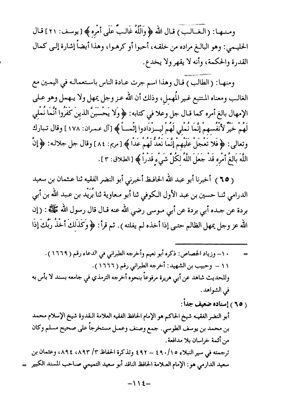 65 - أَخْبَرَنَا أَبُو عَبْدِ اللَّهِ الْحَافِظُ , أَخْبَرَنِي أَبُو النَّضْرِ الْفَقِيهُ , ثنا عُثْمَانُ بْنُ سَعِيدٍ الدَّارِمِيُّ , ثنا حُسَيْنُ بْنُ عَبْدِ الْأَوَّلِ الْكُوفِيُّ , ثنا أَبُو مُعَاوِيَةَ , ثنا بُرَيْدُ بْنُ عَبْدِ اللَّهِ بْنِ أَبِي بُرْدَةَ , عَنْ جَدِّهِ أَبِي بُرْدَةَ , عَنْ أَبِي مُوسَى , رَضِيَ اللَّهُ عَنْهُ قَالَ: قَالَ رَسُولُ اللَّهِ صَلَّى اللهُ عَلَيْهِ وَسَلَّمَ: §«إِنَّ اللَّهَ عَزَّ وَجَلَّ يُمْهِلُ الظَّالِمَ حَتَّى إِذَا أَخَذَهُ لَمْ يُفْلِتْهُ» ثُمَّ قَرَأَ: {وَكَذَلِكَ أَخْذُ رَبِّكَ إِذَا -[115]- أَخَذَ الْقُرَى وَهِيَ ظَالِمَةٌ} [هود: 102] رَوَاهُ الْبُخَارِيُّ فِي الصَّحِيحِ عَنْ صَدَقَةَ بْنِ الْفَضْلِ , وَرَوَاهُ مُسْلِمٌ عَنْ مُحَمَّدِ بْنِ عَبْدِ اللَّهِ بْنِ نُمَيْرٍ كِلَاهُمَا عَنْ أَبِي مُعَاوِيَةَ وَمِنْهَا «الْوَاسِعُ» قَالَ اللَّهُ عَزَّ وَجَلَّ: {وَاللَّهُ وَاسِعٌ عَلِيمٌ} [البقرة: 247] وَرُوِّينَاهُ فِي خَبَرِ الْأَسَامِي وَقَالَ الْحَلِيمِيُّ: وَمَعْنَاهُ الْكَثِيرُ مَقْدُورَاتُهُ وَمَعْلُومَاتُهُ , وَاعْتِرَافٌ لَهُ بِأَنَّهُ لَا يُعْجِزُهُ شَيْءٌ , وَلَا يَخْفَى عَلَيْهِ شَيْءٌ , وَرَحْمَتُهُ وَسِعَتْ كُلَّ شَيْءٍ , قَالَ أَبُو سُلَيْمَانَ: الْوَاسِعُ: الْغَنِيُّ الَّذِي وَسِعَ غِنَاهُ مَفَاقِرَ عِبَادِهِ , وَوَسِعَ رِزْقُهُ جَمِيعَ خَلْقِهِ وَمِنْهَا «الْجَمِيلُ» قَالَ الْحَلِيمِيُّ: وَهَذَا الِاسْمُ فِي بَعْضِ الْأَخْبَارِ عَنِ النَّبِيِّ صَلَّى اللهُ عَلَيْهِ وَسَلَّمَ , وَمَعْنَاهُ ذُو الْأَسْمَاءِ الْحُسْنَى , لِأَنَّ الْقَبَائِحَ إِذْ لَمْ تَلِقْ بِهِ لَمْ يَجُزْ أَنْ يُشْتَقَّ اسْمُهُ مِنْ أَسْمَائِهَا , وَإِنَّمَا تُشْتَقُّ أَسْمَاؤُهُ مِنْ صِفَاتِهِ الَّتِي كُلُّهَا مَدَائِحُ , وَأَفْعَالُهُ الَّتِي أَجْمَعُهَا حِكْمَةٌ وَقَالَ الْخَطَّابِيُّ: الْجَمِيلُ هُوَ الْمُجَمِّلُ الْمُحَسِّنُ , فَعِيلٌ بِمَعْنَى مُفَعِّلٍ , وَقَدْ يَكُونُ الْجَمِيلُ مَعْنَاهُ ذُو النُّورِ وَالْبَهْجَةِ , وَقَدْ رُوِيَ فِي الْحَدِيثِ «إِنَّ اللَّهَ جَمِيلٌ يُحِبُّ الْجَمَالَ»