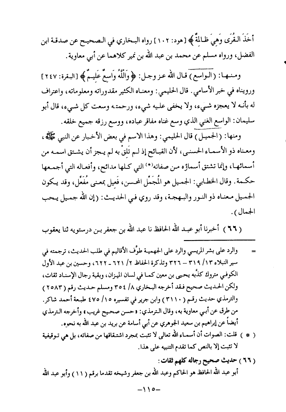 66 - أَخْبَرَنَا أَبُو عَبْدِ اللَّهِ الْحَافِظُ , نا عَبْدُ اللَّهِ بْنُ جَعْفَرِ بْنِ دُرُسْتَوَيْهِ , ثنا يَعْقُوبُ -[116]- بْنُ سُفْيَانَ , ثنا أَبُو بَكْرٍ , يَحْيَى بْنُ حَمَّادٍ ح وَأَخْبَرَنَا أَبُو عَبْدُ اللَّهِ الْحَافِظُ , ثنا أَبُو عَبْدِ اللَّهِ مُحَمَّدُ بْنُ يَعْقُوبَ , ثنا عَلِيُّ بْنُ الْحَسَنِ الْهِلَالِيُّ , ثنا يَحْيَى بْنُ حَمَّادٍ , ثنا شُعْبَةُ , ثنا أَبَانُ بْنُ تَغْلِبَ , عَنْ فُضَيْلِ بْنِ عَمْرٍو , عَنْ إِبْرَاهِيمَ , عَنْ عَلْقَمَةَ , عَنْ عَبْدِ اللَّهِ بْنِ مَسْعُودٍ , رَضِيَ اللَّهُ عَنْهُ عَنْ رَسُولِ اللَّهِ صَلَّى اللهُ عَلَيْهِ وَسَلَّمَ قَالَ: §«لَا يَدْخُلُ الْجَنَّةَ مَنْ كَانَ فِي قَلْبِهِ مِثْقَالُ ذَرَّةٍ مِنْ كِبْرٍ , وَلَا يَدْخُلُ النَّارَ مَنْ كَانَ فِي قَلْبِهِ مِثْقَالُ ذَرَّةٍ مِنْ إِيمَانٍ» فَقَالَ رَجُلٌ: يَا رَسُولَ اللَّهِ , الرَّجُلُ يُحِبُّ أَنْ يَكُونَ ثَوْبُهُ حَسَنًا وَنَعْلُهُ حَسَنًا , فَقَالَ رَسُولُ اللَّهِ صَلَّى اللهُ عَلَيْهِ وَسَلَّمَ: «إِنَّ اللَّهَ جَمِيلٌ يُحِبُّ الْجَمَالَ , الْكِبْرُ مَنْ بَطَرَ الْحَقَّ وَغَمَصَ النَّاسَ» رَوَاهُ مُسْلِمٌ فِي الصَّحِيحِ عَنْ مُحَمَّدِ بْنِ مُثَنَّى وَغَيْرِهِ عَنْ يَحْيَى بْنِ حَمَّادٍ وَرُوِّينَاهُ مِنْ وَجْهٍ آخَرَ عَنِ ابْنِ مَسْعُودٍ رَضِيَ اللَّهُ عَنْهُ , وَمَنْ وَجْهٍ آخَرَ عَنْ أَبِي رَيْحَانَةَ , وَمِنْ وَجْهٍ آخَرَ عَنْ ثَابِتِ بْنِ قَيْسِ بْنِ شَمَّاسِ عَنِ النَّبِيِّ صَلَّى اللهُ عَلَيْهِ وَسَلَّمَ وَرُوِّينَاهُ فِي خَبَرِ عَبْدِ الْعَزِيزِ بْنِ الْحُصَيْنِ وَمِنْهَا «الْوَاجِدُ» وَهُوَ فِي خَبَرِ الْأَسَامِي , قَالَ الْحَلِيمِيُّ: وَمَعْنَاهُ الَّذِي لَا يَضِلُّ عَنْهُ شَيْءٌ , وَلَا يَفُوتُهُ شَيْءٌ , وَقِيلَ: هُوَ الْغَنِيُّ الَّذِي لَا يَفْتَقِرُ , وَالْوِجْدُ الْغِنَى ذَكَرَهُ الْخَطَّابِيُّ -[117]- وَمِنْهَا «الْمُحْصِي» وَهُوَ فِي خَبَرِ الْأَسَامِي , وَفِي الْكِتَابِ: {وَأَحْصَى كُلَّ شَيْءٍ عَدَدًا} [الجن: 28] قَالَ الْحَلِيمِيُّ: وَمَعْنَاهُ الْعَالِمُ بِمَقَادِيرِ الْحَوَادِثِ مَا يُحِيطُ بِهِ مِنْهَا عُلُومُ الْعِبَادِ , وَمَا لَا يُحِيطُ بِهِ مِنْهَا عُلُومُهُمْ , كَالْأَنْفَاسِ وَالْأَرْزَاقِ وَالطَّاعَاتِ وَالْمَعَاصِي وَالْقُرَبِ , وَعَدَدِ الْقَطْرِ وَالرَّمْلِ وَالْحَصَا وَالنَّبَاتِ وَأَصْنَافِ الْحَيَوَانِ وَالْمَوَاتِ وَعَامَّةِ الْمَوْجُودَاتِ , وَمَا يَبْقَى مِنْهَا أَوْ يَضْمَحِلُّ وَيَفْنَى , وَهَذَا رَاجِعٌ إِلَى نَفْيِ الْعَجْزِ الْمَوْجُودِ فِي الْمَخْلُوقِينَ عَنْ إِدْرَاكِ مَا يَكْثُرُ مِقْدَارُهُ وَيَتَوَالَى وُجُودُهُ , وَتَتَفَاوَتُ أَحْوَالُهُ عَنْهُ عَزَّ اسْمُهُ وَمِنْهَا «الْقَوِيُّ» قَالَ اللَّهُ عَزَّ وَجَلَّ: {إِنَّ اللَّهَ لِقَوِيُّ عَزِيزٌ} [الحج: 40] وَرُوِّينَاهُ فِي خَبَرِ الْأَسَامِي , قَالَ: أَبُو سُلَيْمَانَ: الْقَوِيُّ قَدْ يَكُونُ بِمَعْنَى الْقَادِرِ وَمَنْ قَوِيَ عَلَى شَيْءٍ فَقَدْ قَدَرَ عَلَيْهِ , وَقَدْ يَكُونُ مَعْنَاهُ التَّامَّ الْقُوَّةِ الَّذِي لَا يَسْتَوْلِي عَلَيْهِ الْعَجْزُ فِي حَالٍ مِنَ الْأَحْوَالِ , وَالْمَخْلُوقُ وَإِنْ وُصِفَ بِالْقُوَّةِ فَإِنَّ قُوَّتَهُ مُتَنَاهِيَةٌ , وَعَنْ بَعْضِ الْأُمُورِ قَاصِرَةٌ وَمِنْهَا «الْمَتِينُ» قَالَ اللَّهُ عَزَّ وَجَلَّ: {إِنَّ اللَّهَ هُوَ الرَّزَّاقُ ذُو الْقُوَّةِ الْمَتِينُ} [الذاريات: 58] وَهُوَ فِي خَبَرِ الْأَسَامِي
