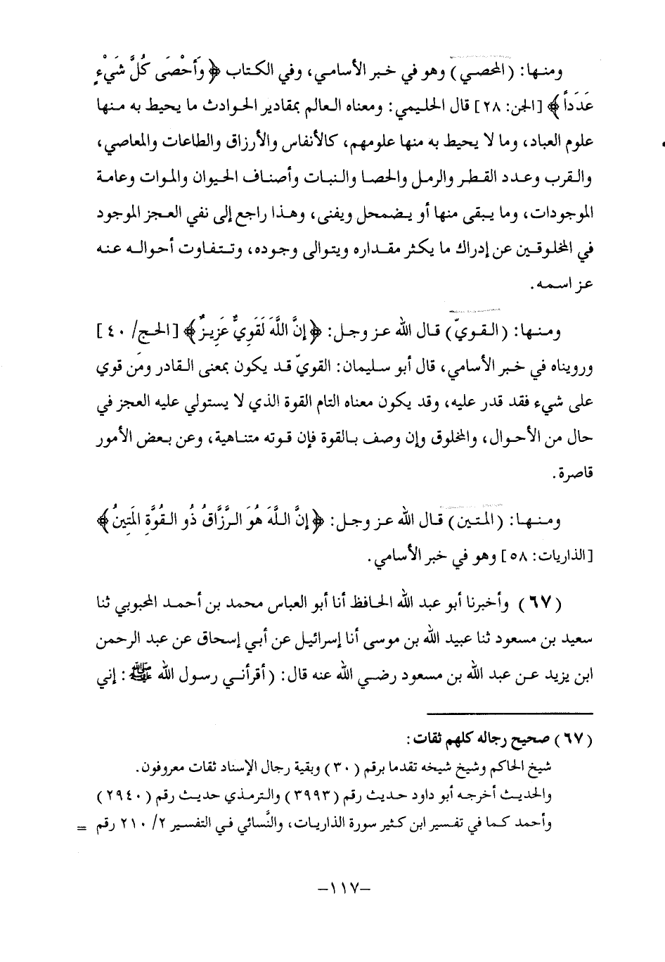 67 - وَأَخْبَرَنَا أَبُو عَبْدِ اللَّهِ الْحَافِظُ , أنا أَبُو الْعَبَّاسِ مُحَمَّدُ بْنُ أَحْمَدَ الْمَحْبُوبِيُّ , ثنا سَعِيدُ بْنُ مَسْعُودٍ , ثنا عُبَيْدُ اللَّهِ بْنُ مُوسَى , أنا إِسْرَائِيلُ , عَنْ أَبِي إِسْحَاقَ , عَنْ عَبْدِ الرَّحْمَنِ بْنِ يَزِيدَ , عَنْ عَبْدِ اللَّهِ بْنِ مَسْعُودٍ , رَضِيَ اللَّهُ عَنْهُ قَالَ: §أَقْرَأَنِي رَسُولُ اللَّهِ صَلَّى اللهُ عَلَيْهِ وَسَلَّمَ: إِنِّي -[118]- أَنَا الرَّزَّاقُ ذُو الْقُوَّةِ الْمَتِينُ قَالَ الْحَلِيمِيُّ: وَهُوَ الَّذِي لَا تَتَنَاقَصُ قُوَّتُهُ فَيَهِنَ وَيَفْتُرَ , إِذْ كَانَ يَحْدُثُ مَا يَحْدُثُ فِي غَيْرِهِ لَا فِي نَفْسِهِ , وَكَانَ التَّغَيُّرُ لَا يَجُوزُ عَلَيْهِ