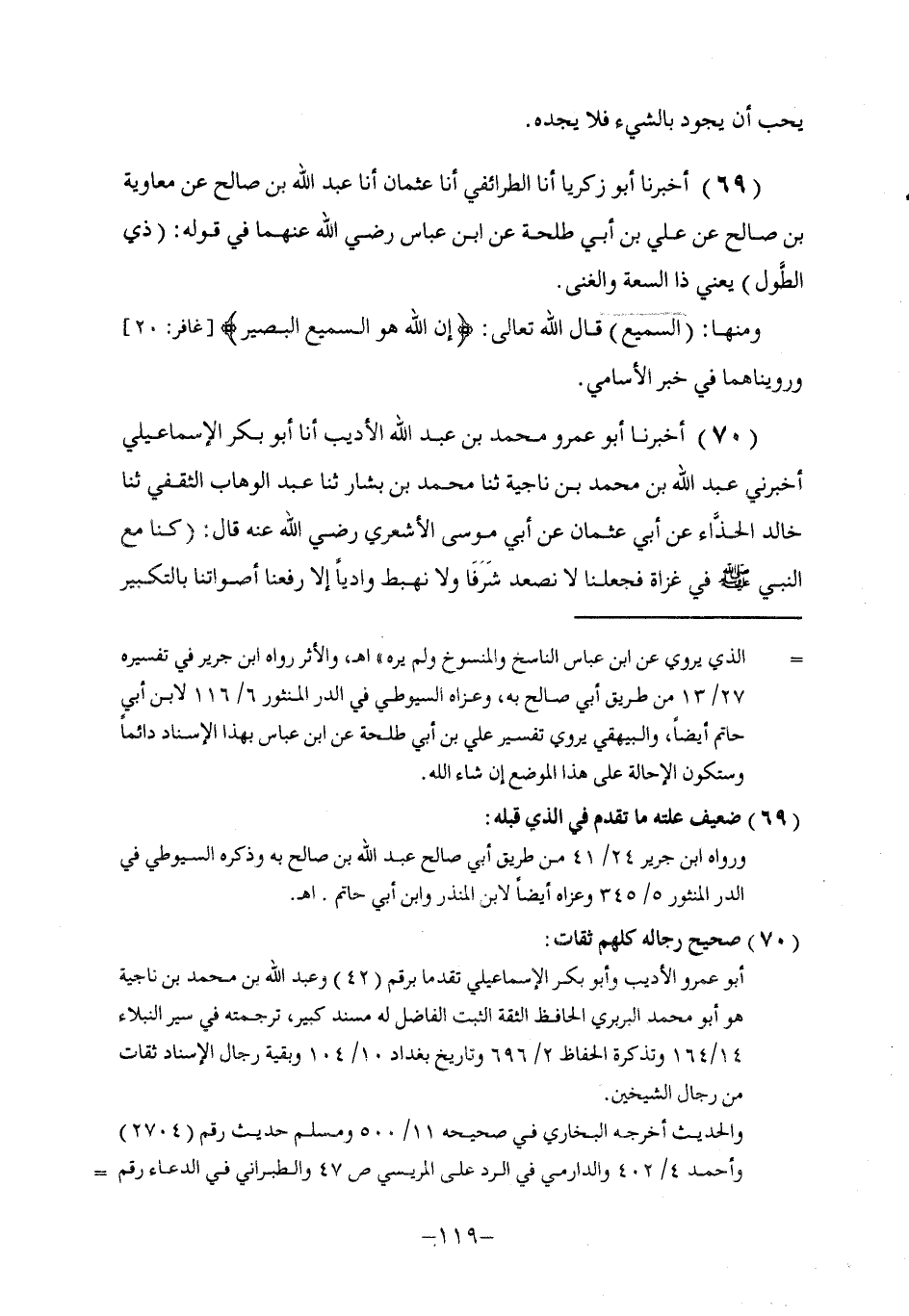 69 - أَخْبَرَنَا أَبُو زَكَرِيَّا , أنا الطَّرَائِفِيُّ , أنا عُثْمَانُ , أنا عَبْدُ اللَّهِ بْنُ صَالِحٍ , عَنْ مُعَاوِيَةَ بْنِ صَالِحٍ , عَنْ عَلِيِّ بْنِ أَبِي طَلْحَةَ , عَنِ ابْنِ عَبَّاسٍ , رَضِيَ اللَّهُ عَنْهُمَا فِي قَوْلِهِ: {§ذِي الطَّوْلِ} [غافر: 3] يَعْنِي السَّعَةَ وَالْغِنَى وَمِنْهَا «السَّمِيعُ» قَالَ اللَّهُ تَعَالَى: {إِنَّ اللَّهَ هُوَ السَّمِيعُ الْبَصِيرُ} [غافر: 20] وَرُوِّينَاهُمَا فِي خَبَرِ الْأَسَامِي
