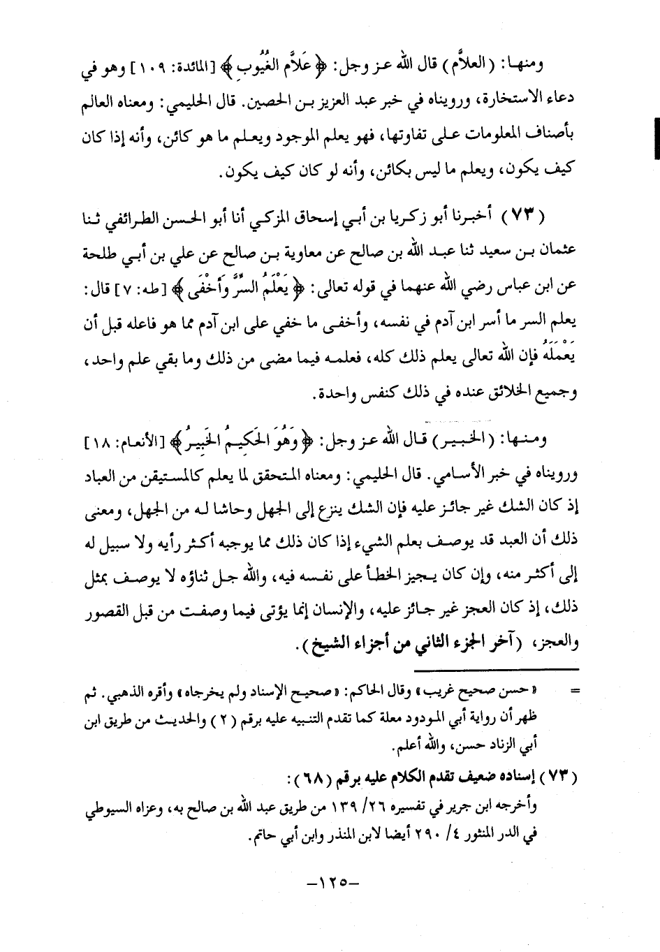 73 - أَخْبَرَنَا أَبُو زَكَرِيَّا بْنُ أَبِي إِسْحَاقَ الْمُزَكِّي , أنا أَبُو الْحَسَنِ الطَّرَائِفِيُّ , ثنا عُثْمَانُ بْنُ سَعِيدٍ , ثنا عَبْدُ اللَّهِ بْنُ صَالِحٍ , عَنْ مُعَاوِيَةَ بْنِ صَالِحٍ , عَنْ عَلِيِّ بْنِ أَبِي طَلْحَةَ , عَنِ ابْنِ عَبَّاسٍ , رَضِيَ اللَّهُ عَنْهُمَا فِي قَوْلِهِ تَعَالَى: {§يَعْلَمُ السِّرَّ وَأَخْفَى} [طه: 7] قَالَ: يَعْلَمُ السِّرَّ مَا أَسَرَّ ابْنُ آدَمَ فِي نَفْسِهِ , وَأَخْفَى مَا خَفِيَ عَلَى ابْنِ آدَمَ مِمَّا هُوَ فَاعِلُهُ قَبْلَ أَنْ يَعْمَلَهُ فَإِنَّ اللَّهَ تَعَالَى يَعْلَمُ ذَلِكَ كُلَّهُ , فَعِلْمُهُ فِيمَا مَضَى مِنْ ذَلِكَ وَمَا بَقِيَ عِلْمٌ وَاحِدٌ , وَجَمِيعُ الْخَلَائِقِ عِنْدَهُ فِي ذَلِكَ كَنَفْسٍ وَاحِدَةٍ وَمِنْهَا «الْخَبِيرُ» قَالَ اللَّهُ عَزَّ وَجَلَّ: {وَهُوَ الْحَكِيمُ الْخَبِيرُ} [الأنعام: 18] وَرُوِّينَاهُ فِي خَبَرِ الْأَسَامِي قَالَ الْحَلِيمِيُّ: وَمَعْنَاهُ الْمُتَحَقِّقُ لِمَا يَعْلَمُ كَالْمُسْتَيْقِنِ مِنَ الْعِبَادِ إِذْ كَانَ الشَّكُّ غَيْرَ جَائِزٍ عَلَيْهِ فَإِنَّ الشَّكَّ يَنْزِعُ إِلَى الْجَهْلِ وَحَاشَا لَهُ مِنَ الْجَهْلِ , وَمَعْنَى ذَلِكَ أَنَّ الْعَبْدَ قَدْ يُوصَفُ بِعِلْمِ الشَّيْءِ إِذَا كَانَ ذَلِكَ مِمَّا يُوجِبُهُ أَكْثَرُ رَأْيِهِ وَلَا سَبِيلَ لَهُ إِلَى أَكْثَرِ مِنْهُ , وَإِنْ كَانَ يُجِيزُ الْخَطَأَ عَلَى نَفْسِهِ فِيهِ , وَاللَّهُ جَلَّ ثَنَاؤُهُ لَا يُوصَفُ بِمِثْلِ ذَلِكَ , إِذْ كَانَ الْعَجْزُ غَيْرَ جَائِزٍ عَلَيْهِ , وَالْإِنْسَانُ إِنَّمَا يُؤْتَى فِيمَا وَصَفْتُ مِنْ قِبَلِ الْقُصُورِ وَالْعَجْزِ -[126]- وَمِنْهَا «الشَّهِيدُ» قَالَ اللَّهُ جَلَّ ثَنَاؤُهُ: {إِنَّ اللَّهَ عَلَى كُلِّ شَيْءٍ شَهِيدٌ} [الحج: 17] وَقَالَ جَلَّ وَعَلَا:: {وَكَفَى بِاللَّهِ شَهِيدًا} [النساء: 79] , وَرُوِّينَاهُ فِي خَبَرِ الْأَسَامِي