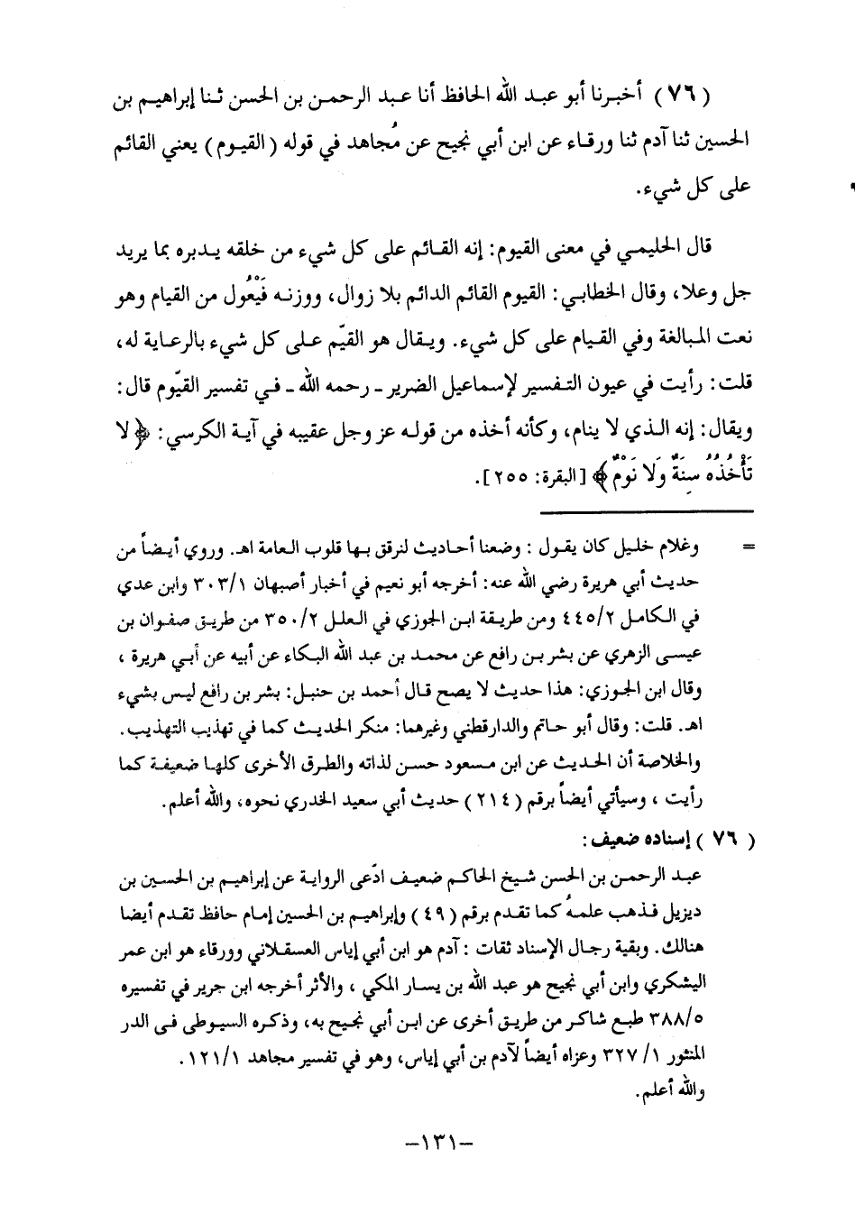 76 - أَخْبَرَنَا أَبُو عَبْدِ اللَّهِ الْحَافِظُ , أنا عَبْدُ الرَّحْمَنِ بْنُ الْحَسَنِ , ثنا إِبْرَاهِيمُ بْنُ الْحُسَيْنِ , ثنا آدَمُ , ثنا وَرْقَاءُ , عَنِ ابْنِ أَبِي نُجَيْحٍ , عَنْ مُجَاهِدٍ , فِي قَوْلِهِ: {§الْقَيُّومُ} [البقرة: 255] يَعْنِي الْقَائِمُ عَلَى كُلِّ شَيْءٍ قَالَ الْحَلِيمِيُّ فِي مَعْنَى الْقَيُّومِ: إِنَّهُ الْقَائِمُ عَلَى كُلِّ شَيْءٍ مِنْ خَلْقِهِ يُدَبِّرُهُ بِمَا يُرِيدُ جَلَّ وَعَلَا , وَقَالَ الْخَطَّابِيُّ: الْقَيُّومُ الْقَائِمُ الدَّائِمُ بِلَا زَوَالٍ , وَوَزْنُهُ فَيْعُولٌ مِنَ الْقِيَامِ وَهُوَ نَعْتُ الْمُبَالَغَةِ وَفِي الْقِيَامِ عَلَى كُلِّ شَيْءٍ وَيُقَالُ: هُوَ الْقَيِّمُ عَلَى كُلِّ شَيْءٍ بِالرِّعَايَةِ لَهُ قُلْتُ: رَأَيْتُ فِيَ عُيُونِ التَّفْسِيرِ لِإِسْمَاعِيلَ الضَّرِيرِ - رَحِمَهُ اللَّهُ - فِي تَفْسِيرِ الْقَيُّومِ , قَالَ: وَيُقَالُ: إِنَّهُ الَّذِي لَا يَنَامُ , وَكَأَنَّهُ أَخَذَهُ مِنْ قَوْلِهِ عَزَّ وَجَلَّ عَقِيبِهِ فِي آيَةِ الْكُرْسِي: {لَا تَأْخُذُهُ سِنَةٌ وَلَا نَوْمٌ} [البقرة: 255]