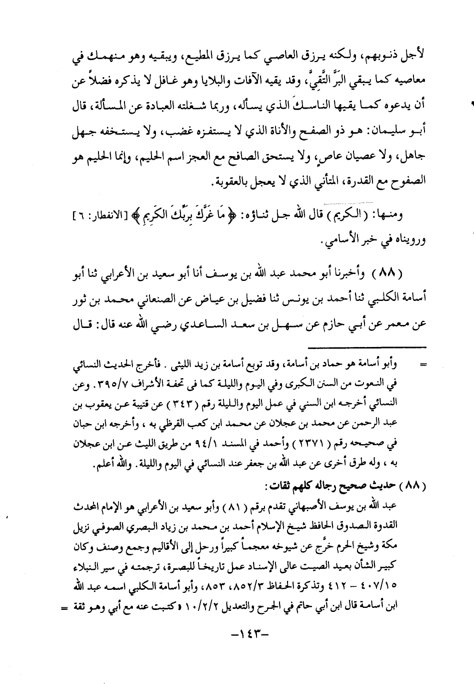 88 - وَأَخْبَرَنَا أَبُو مُحَمَّدٍ عَبْدُ اللَّهِ بْنُ يُوسُفَ , أنا أَبُو سَعِيدِ بْنُ الْأَعْرَابِيُّ , ثنا أَبُو أُسَامَةَ الْكَلْبِيُّ , ثنا أَحْمَدُ بْنُ يُونُسَ , ثنا فُضَيْلُ بْنُ عِيَاضٍ , عَنِ الصَّنْعَانِيِّ , مُحَمَّدِ بْنِ ثَوْرٍ عَنْ مَعْمَرٍ , عَنْ أَبِي حَازِمٍ , عَنْ سَهْلِ بْنِ سَعْدٍ السَّاعِدِيِّ , رَضِيَ اللَّهُ عَنْهُ قَالَ: قَالَ -[144]- رَسُولُ اللَّهِ صَلَّى اللهُ عَلَيْهِ وَسَلَّمَ: §«إِنَّ اللَّهَ عَزَّ اسْمُهُ كَرِيمٌ يُحِبُّ مَكَارِمَ الْأَخْلَاقِ وَيُبْغِضُ سَفْسَافَهَا»