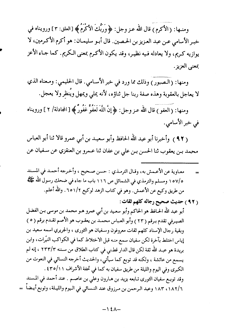 92 - وَأَخْبَرَنَا أَبُو عَبْدِ اللَّهِ الْحَافِظُ وَأَبُو سَعِيدِ بْنُ أَبِي عَمْرٍو , قَالَا: ثنا أَبُو الْعَبَّاسِ مُحَمَّدُ بْنُ يَعْقُوبَ , ثنا الْحَسَنُ بْنُ عَلِيِّ بْنِ عَفَّانَ , ثنا عَمْرُو بْنُ الْعَنْقَزِيِّ , عَنْ سُفْيَانَ , عَنِ -[149]- الْجُرَيْرِيِّ , عَنِ ابْنِ بُرَيْدَةَ , عَنْ عَائِشَةَ , رَضِيَ اللَّهُ عَنْهَا قَالَتْ: قُلْتُ: يَا رَسُولَ اللَّهِ إِنْ أَنَا وَافَقْتُ لَيْلَةَ الْقَدْرِ مَا أَقُولُ؟ , قَالَ: " قُولِي: §اللَّهُمَّ إِنَّكَ عَفُوٌّ تُحِبُّ الْعَفْوَ فَاعْفُ عَنِّي أَوِ اعْفُ عَنَّا " قَالَ الْحَلِيمِيُّ فِي مَعْنَى الْعَفُوِّ: إِنَّهُ الْوَاضِعُ عَنْ عِبَادِهِ تَبِعَاتِ خَطَايَاهُمْ وَآثَامِهِمْ , فَلَا يَسْتَوْفِيهَا مِنْهُمْ , وَذَلِكَ إِذَا تَابُوا وَاسْتَغْفَرُوا , أَوْ تَرَكُوا لِوَجْهِهِ أَعْظَمَ مَا فَعَلُوا لِيُكَفِّرَ عَنْهُمْ مَا فَعَلُوا بِمَا تَرَكُوا , أَوْ بِشَفَاعَةِ مَنْ يَشْفَعُ لَهُمْ , أَوْ يَجْعَلُ ذَلِكَ كَرَامَةً لِذِي حُرْمَةٍ لَهُمْ بِهِ وَجَزَاءً لَهُ بِعَمَلِهِ , قَالَ أَبُو سُلَيْمَانَ: الْعَفُوُّ وَزْنُهُ فَعُولٌ مِنَ الْعَفْوِ وَهُوَ بِنَاءُ الْمُبَالَغَةِ , وَالْعَفْوُ الصَّفْحُ عَنِ الذَّنْبِ , وَقِيلَ: إِنَّ الْعَفْوَ مَأْخُوذٌ مِنْ عَفَتِ الرِّيحُ الْأَثَرَ إِذَا دَرَسَتْهُ , فَكَأَنَّ الْعَافِيَ عَنِ الذَّنْبِ يَمْحُوهُ بِصَفْحِهِ عَنْهُ وَمِنْهَا «الْغَافِرُ» قَالَ اللَّهُ جَلَّ ثَنَاؤُهُ: {غَافِرِ الذَّنْبِ وَقَابِلِ التَّوْبِ} [غافر: 3] , قَالَ الْحَلِيمِيُّ: وَهُوَ الَّذِي يَسْتُرُ عَلَى الْمُذْنِبِ وَلَا يُؤَاخِذُهُ بِهِ فَيُشَهِّرُهُ وَيَفْضَحُهُ