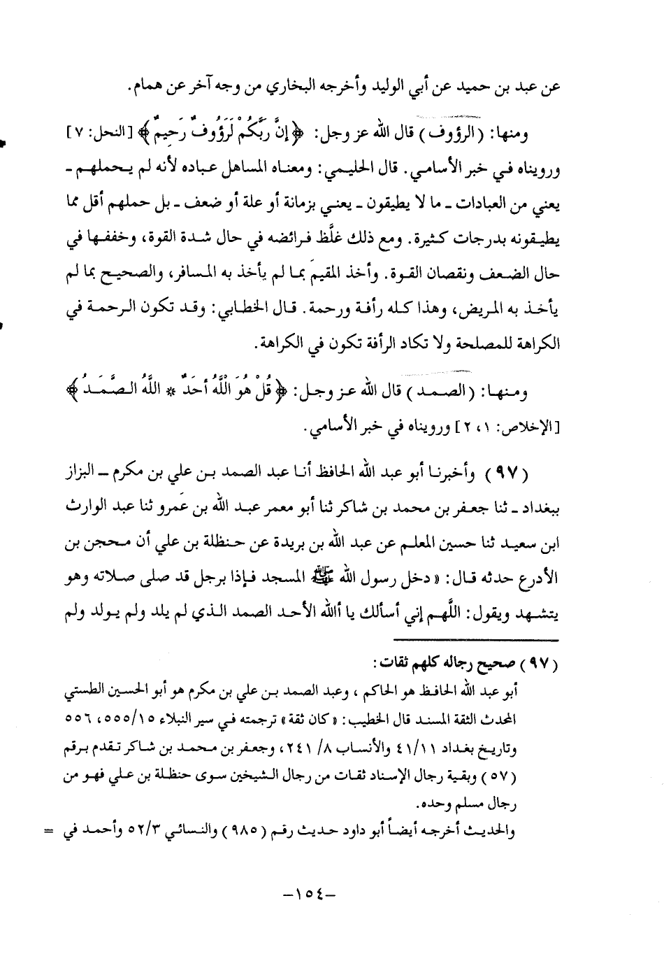 97 - وَأَخْبَرَنَا أَبُو عَبْدِ اللَّهِ الْحَافِظُ , أنا عَبْدُ الصَّمَدِ بْنُ عَلِيِّ بْنِ مُكْرَمٍ الْبَزَّازُ , بِبَغْدَادَ ثنا جَعْفَرُ بْنُ مُحَمَّدِ بْنِ شَاكِرٍ , ثنا أَبُو مَعْمَرٍ عَبْدُ اللَّهِ بْنُ عَمْرٍو , ثنا عَبْدُ الْوَارِثِ بْنُ سَعِيدٍ , ثنا حُسَيْنٌ الْمُعَلِّمُ، عَنْ اللهِ بْنِ بُرَيْدَةَ , عَنْ حَنْظَلَةَ بْنِ عَلِيٍّ , أَنَّ مِحْجَنَ بْنَ الْأَدْرَعِ , حَدَّثَهُ قَالَ: دَخَلَ رَسُولُ اللَّهِ صَلَّى اللهُ عَلَيْهِ وَسَلَّمَ الْمَسْجِدَ فَإِذَا بِرَجُلٍ قَدْ صَلَّى صَلَاتَهُ وَهُوَ يَتَشَهَّدُ وَيَقُولُ: §اللَّهُمَّ إِنِّي أَسْأَلُكُ يَا اللَّهُ الْأَحَدُ الصَّمَدُ الَّذِي لَمْ يَلِدْ وَلَمْ يُولَدْ وَلَمْ -[155]- يَكُنْ لَهُ كُفُوًا أَحَدٌ , أَنْ تَغْفِرَ لِي ذُنُوبِي إِنَّكَ أَنْتَ الْغَفُورُ الرَّحِيمُ قَالَ: فَقَالَ: «قَدْ غُفِرَ لَهُ , قَدْ غُفِرَ لَهُ , قَدْ غُفِرَ لَهُ , قَدْ غُفِرَ لَهُ» رَوَاهُ أَبُو دَاوُدَ فِي السُّنَنِ عَنْ أَبِي مَعْمَرٍ قَالَ الْحَلِيمِيُّ: مَعْنَاهُ الْمَصْمُودُ بِالْحَوَائِجِ أَيِ الْمَقْصُودُ بِهَا , وَقَدْ يُقَالُ ذَلِكَ عَلَى مَعْنَى أَنَّهُ الْمُسْتَحِقُّ لِأَنْ يُقْصَدَ بِهَا , ثُمَّ لَا يَبْطُلُ هَذَا الِاسْتِحْقَاقُ وَلَا تَزُولُ هَذِهِ الصِّفَةُ بِذَهَابِ مَنْ يَذْهَبُ عَنِ الْحَقِّ , وَيَضِلُّ السَّبِيلَ , لِأَنَّهُ إِذَا كَانَ هُوَ الْخَالِقُ وَالْمُدَبِّرُ لِمَا خَلَقَ لَا خَالِقَ غَيْرُهُ وَلَا مُدَبِّرَ سِوَاهُ , فَالذَّهَابُ عَنْ قَصْدِهِ بِالْحَاجَةِ وَهِيَ بِالْحَقِيقَةِ وَاقِعَةٌ إِلَيْهِ وَلَا قَاضِيَ لَهَا غَيْرُهُ , جَهْلٌ وَحُمْقٌ , وَالْجَهْلُ بِاللَّهِ تَعَالَى جِدُّهُ كُفْرٌ