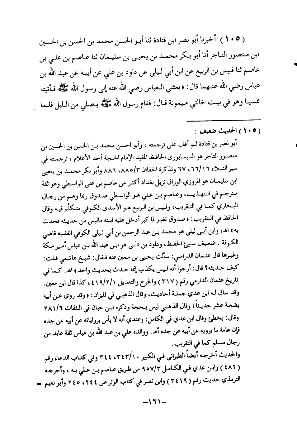 105 - أَخْبَرَنَا أَبُو نَصْرِ بْنُ قَتَادَةَ , ثنا أَبُو الْحَسَنِ مُحَمَّدُ بْنُ الْحَسَنِ بْنِ الْحُسَيْنِ بْنِ مَنْصُورٍ التَّاجِرُ , أنا أَبُو بَكْرٍ مُحَمَّدُ بْنُ يَحْيَى بْنِ سُلَيْمَانَ , ثنا عَاصِمُ بْنُ عَلِيِّ بْنِ عَاصِمٍ , ثنا قَيْسُ بْنُ الرَّبِيعِ , عَنِ ابْنِ أَبِي لَيْلَى , عَنْ دَاوُدَ بْنِ عَلِيٍّ , عَنْ أَبِيهِ , عَنْ عَبْدِ اللَّهِ بْنِ عَبَّاسٍ , رَضِيَ اللَّهُ عَنْهُمَا قَالَ: بَعَثَنِي الْعَبَّاسُ رَضِيَ اللَّهُ عَنْهُ إِلَى رَسُولِ اللَّهِ صَلَّى اللهُ عَلَيْهِ وَسَلَّمَ فَأَتَيْتُهُ مُمْسِيًا وَهُوَ فِي بَيْتِ خَالَتِي مَيْمُونَةَ , قَالَ: فَقَامَ رَسُولُ اللَّهِ صَلَّى اللهُ عَلَيْهِ وَسَلَّمَ يُصَلِّي مِنَ اللَّيْلِ فَلَمَّا -[162]- صَلَّى الرَّكْعَتَيْنِ قَبْلَ الْفَجْرِ قَالَ: §«اللَّهُمَّ إِنِّي أَسْأَلُكُ رَحْمَةً مِنْ عِنْدِكَ تَهْدِي بِهَا قَلْبِي , وَتَجْمَعُ بِهَا شَمْلِي وَتَلُمُّ بِهَا شَعَثِي , وَتَرُدُّ بِهَا أُلْفَتِي وَتُصْلِحُ بِهَا دِينِي , وَتَحْفَظُ بِهَا غَائِبِي , وَتَرْفَعُ بِهَا شَاهِدِي , وَتُزَكِّي بِهَا عَمَلِي , وَتُبَيِّضُ بِهَا وَجْهِي , وَتُلْهِمُنِي بِهَا رُشْدِي , وَتَعْصِمُنِي بِهَا مِنْ كُلِّ سُوءٍ , اللَّهُمَّ أَعْطِنِي إِيمَانًا صَادِقًا , وَيَقِينًا لَيْسَ بَعْدَهُ كُفْرٌ , وَرَحْمَةً أَنَالُ بِهَا شَرَفَ كَرَامَتِكَ فِي الدُّنْيَا وَالْآخِرَةِ , اللَّهُمَّ إِنِّي أَسْأَلُكُ الْفَوْزَ عِنْدَ الْقَضَاءِ , وَنُزُلَ الشُّهَدَاءِ , وَعَيْشَ السُّعَدَاءِ , وَمُرَافَقَةَ الْأَنْبِيَاءِ , وَالنَّصْرَ عَلَى الْأَعْدَاءِ , اللَّهُمَّ إِنِّي أُنْزِلُ بِكَ حَاجَتِي وَإِنْ قَصُرَ رَأْيِي وَضَعُفَ عَمَلِي وَافْتَقَرْتُ إِلَى رَحْمَتِكَ , فَأَسْأَلُكَ يَا قَاضِيَ الْأُمُورِ , وَيَا شَافِيَ الصُّدُورِ , كَمَا تُجِيرُ بَيْنَ الْبُحُورِ أَنْ تُجِيرَنِي مِنْ عَذَابِ السَّعِيرِ , وَمِنْ دَعْوَةِ الثُّبُورِ , وَمَنْ فِتْنَةِ الْقُبُورِ , اللَّهُمَّ مَا قَصُرَ عَنْهُ رَأْيِي وَضَعُفَ عَنْهُ عَمَلِي وَلَنْ تَبْلُغَهُ نِيَّتِي أَوْ أُمْنِيَتِي، شَكَّ عَاصِمٌ، مِنْ خَيْرٍ وَعَدْتَهُ أَحَدًا مِنْ عِبَادِكَ , أَوْ خَيْرٍ أَنْتَ مُعْطِيهِ أَحَدًا مِنْ خَلَقِكَ , فَإِنِّي أَرْغَبُ إِلَيْكَ فِيهِ وَأَسْأَلُكَ يَا رَبَّ الْعَالَمِينَ، -[163]- اللَّهُمَّ اجْعَلْنَا هَادِينَ مَهْدِيِّينَ غَيْرَ ضَالِّينَ وَلَا مُضِلِّينَ , حَرْبًا لِأَعْدَائِكَ سِلْمًا لِأَوْلِيَائِكَ نُحِبُّ بِحُبِّكَ النَّاسَ , وَنُعَادِي بِعَدَاوَتِكَ مَنْ خَالَفَكَ مِنْ خَلْقِكَ , اللَّهُمَّ هَذَا الدُّعَاءُ وَعَلَيْكَ الْإِجَابَةُ وَهَذَا الْجَهْدُ وَعَلَيْكَ التُّكْلَانُ وَلَا حَوْلَ وَلَا قُوَّةَ إِلَّا بِاللَّهِ اللَّهُمَّ ذَا الْحَبْلِ الشَّدِيدِ , وَالْأَمْرِ الرَّشِيدِ , أَسْأَلُكَ الْأَمْنَ يَوْمَ الْوَعِيدِ وَالْجَنَّةَ يَوْمَ الْخُلُودِ مَعَ الْمُقَرَّبِينَ الشُّهُودِ وَالرُّكَّعِ السُّجُودِ , الْمُوفِينَ بِالْعُهُودِ , إِنَّكَ رَحِيمٌ وَدُودٌ , وَأَنْتَ تَفْعَلُ مَا تُرِيدُ , سُبْحَانَ الَّذِي يَعْطِفُ بِالْعِزِّ وَقَالَ بِهِ , سُبْحَانَ الَّذِي لَبِسَ الْمَجْدَ وَتَكَرَّمَ بِهِ , سُبْحَانَ الَّذِي لَا يَنْبَغِي التَّسْبِيحُ إِلَّا لَهُ , سُبْحَانَ ذِي الْفَضْلِ وَالنِّعَمِ , سُبْحَانَ ذِي الْقُدْرَةِ وَالْكَرَمِ , سُبْحَانَ الَّذِي أَحْصَى كُلَّ شَيْءٍ بِعِلْمِهِ , اللَّهُمَّ اجْعَلْ لِي نُورًا فِي قَلْبِي , وَنُورًا فِي قَبْرِي , وَنُورًا فِي سَمْعِي وَنُورًا فِي بَصَرِي وَنُورًا فِي شَعْرِي وَنُورًا فِي بَشَرِي وَنُورًا فِي لَحْمِي وَنُورًا فِي دَمِي وَنُورًا فِي عِظَامِي وَنُورًا مِنْ بَيْنِ يَدَيَّ وَنُورًا مِنْ خَلْفِي وَنُورًا عَنْ يَمِينِي وَنُورًا عَنْ شِمَالِي وَنُورً