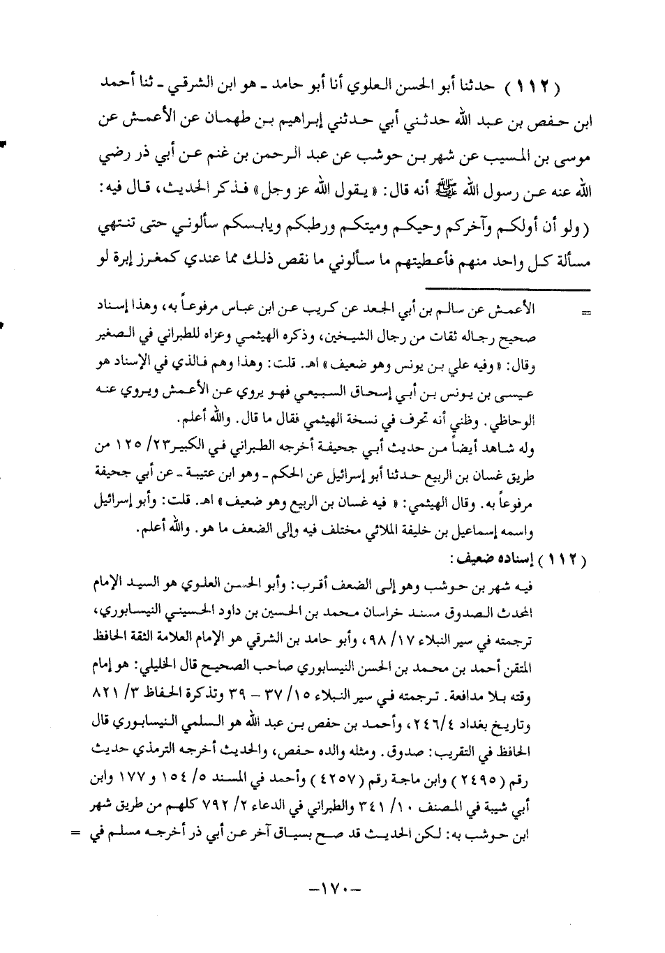 112 - حَدَّثَنَا أَبُو الْحَسَنِ الْعَلَوِيُّ , أنا أَبُو حَامِدٍ , هُوَ ابْنُ الشَّرْقِيِّ ثنا أَحْمَدُ بْنُ حَفْصِ بْنِ عَبْدِ اللَّهِ , حَدَّثَنِي أَبِي , حَدَّثَنِي إِبْرَاهِيمُ بْنُ طَهْمَانَ , عَنِ الْأَعْمَشِ , عَنْ مُوسَى بْنِ الْمُسَيَّبِ , عَنْ شَهْرِ بْنِ حَوْشَبٍ , عَنْ عَبْدِ الرَّحْمَنِ بْنِ غَنْمٍ , عَنْ أَبِي ذَرٍّ , رَضِيَ اللَّهُ عَنْهُ، عَنِ رَسُولِ اللَّهِ صَلَّى اللهُ عَلَيْهِ وَسَلَّمَ أَنَّهُ قَالَ: «يَقُولُ اللَّهُ عَزَّ وَجَلَّ» فَذَكَرَ الْحَدِيثَ , قَالَ فِيهِ: §«وَلَوْ أَنَّ أَوَّلَكُمْ وَآخِرَكُمْ وَحَيَّكُمْ وَمَيِّتَكُمْ وَرَطْبَكُمْ وَيَابِسَكُمْ سَأَلُونِي حَتَّى تَنْتَهِيَ مَسْأَلَةُ كُلِّ وَاحِدٍ مِنْهُمْ فَأَعْطَيْتُهُمْ مَا سَأَلُونِي مَا نَقَصَ ذَلِكَ مِمَّا عِنْدِي كَمِغْرَزِ إِبْرَةٍ لَوْ -[171]- غَمَسَهَا أَحَدُكُمْ فِي الْبَحْرِ وَذَلِكَ أَنِّي جَوَادٌ مَاجِدٌ وَاجِدٌ , عَطَائِي كَلَامٌ وَعَذَابِي كَلَامٌ , إِنَّمَا أَمْرِي لِشَيْءٍ إِذَا أَرَدْتُهُ أَنْ أَقُولَ لَهُ كُنْ فَيَكُونُ» وَمِنْهَا «الْمَنَّانُ» قَالَ الْحَلِيمِيُّ: وَهُوَ الْعَظِيمُ الْمَوَاهِبِ , فَإِنَّهُ أَعْطَى الْحَيَاةَ وَالْعَقْلَ وَالْمَنْطِقَ وَصَوَّرَ فَأَحْسَنَ الصُّوَرَ , وَأَنْعَمَ فَأَجْزَلَ وَأَسْنَى النِّعَمَ , وَأَكْثَرَ الْعَطَايَا وَالْمِنَحَ قَالَ: وَقَوْلُهُ الْحَقُّ: {وَإِنْ تَعُدُّوا نِعْمَةَ اللَّهِ لَا تُحْصُوهَا} [النحل: 18] قَالَ أَبُو سُلَيْمَانَ: وَالْمَنُّ الْعَطَاءُ لِمَنْ لَا يَسْتَثِيبُهُ قُلْتُ وَقَدْ رُوِّينَاهُ فِي رِوَايَةِ عَبْدِ الْعَزِيزِ بْنِ الْحُصَيْنِ , وَفِي حَدِيثِ أَنَسِ بْنِ مَالِكٍ رَضِيَ اللَّهُ عَنْهُ وَمِنْهَا «الْمُقِيتُ» قَالَ اللَّهُ عَزَّ وَجَلَّ: {وَكَانَ اللَّهُ عَلَى كُلِّ شَيْءٍ مُقِيتًا} [النساء: 85] وَهُوَ فِي خَبَرِ الْأَسَامِي قَالَ الْحَلِيمِيُّ: وَعِنْدَنَا أَنَّهُ الْمُمِدُّ , وَأَصْلُهُ مِنَ الْقُوتِ الَّذِي هُوَ مَدَدُ الْبِنْيَةِ , وَمَعْنَاهُ أَنَّهُ دَبَّرَ الْحَيَوَانَاتِ بِأَنْ جَبَلَهَا عَلَى أَنْ يُحَلِّلَ مِنْهَا عَلَى مَمَرِّ الْأَوْقَاتِ شَيْئًا بَعْدَ شَيْءٍ , وَيُعَوِّضَ مِمَّا يَتَحَلَّلُ غَيْرَهُ , فَهُوَ يُمِدُّهَا فِي كُلِّ وَقْتٍ بِمَا جَعَلَهُ قِوَامًا لَهَا إِلَى أَنْ يُرِيدَ إِبْطَالَ شَيْءٍ مِنْهَا , فَيَحْبِسُ عَنْهُ مَا جَعَلَهُ مَادَّةً لِبَقَائِهِ فَيَهْلِكُ