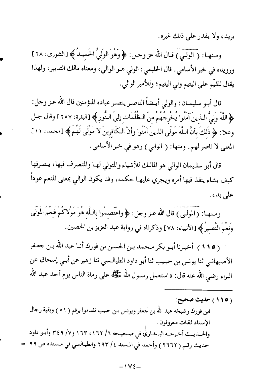 115 - أَخْبَرَنَا أَبُو بَكْرٍ مُحَمَّدُ بْنُ الْحَسَنِ بْنِ فُورَكٍ , أنا عَبْدُ اللَّهِ بْنُ جَعْفَرٍ الْأَصْبَهَانِيُّ , ثنا يُونُسُ بْنُ حَبِيبٍ , ثنا أَبُو دَاوُدَ الطَّيَالِسِيُّ , ثنا زُهَيْرٌ , عَنْ أَبِي إِسْحَاقَ , عَنِ الْبَرَاءِ , رَضِيَ اللَّهُ عَنْهُ قَالَ: اسْتَعْمَلَ رَسُولُ اللَّهِ صَلَّى اللهُ عَلَيْهِ وَسَلَّمَ عَلَى رُمَاةِ النَّاسِ يَوْمَ أُحُدٍ عَبْدَ اللَّهِ -[175]- بْنَ جُبَيْرٍ وَكَانُوا خَمْسِينَ رَجُلًا , وَقَالَ لَهُمْ: كُونُوا مَكَانَكُمْ لَا تَبْرَحُوا , وَإِنْ رَأَيْتُمُ الطَّيْرَ تَخْطَفُنَا , قَالَ الْبَرَاءُ رَضِيَ اللَّهُ عَنْهُ: فَأَنَا وَاللَّهِ رَأَيْتُ النِّسَاءَ بَادِيَاتٍ خَلَاخِيلُهُنَّ قَدِ اسْتَرْخَتْ ثِيَابَهُنَّ يَصْعَدْنَ الْجَبَلَ - يَعْنِي حِينَ انْهَزَمَ الْكُفَّارُ - قَالَ: فَلَمَّا كَانَ مِنَ الْأَمْرِ مَا كَانَ وَالنَّاسُ يُغِيرُونَ مَضَوْا فَقَالَ عَبْدُ اللَّهِ بْنُ جُبَيْرٍ أَمِيرُهُمْ: كَيْفَ تَصْنَعُونَ بِقَوْلِ رَسُولِ اللَّهِ صَلَّى اللهُ عَلَيْهِ وَسَلَّمَ؟ فَمَضَوَا فَكَانَ الَّذِي كَانَ , فَلَمَّا كَانَ اللَّيْلُ جَاءَ أَبُو سُفْيَانَ بْنُ حَرْبٍ , فَقَالَ: أَفِيكُمْ مُحَمَّدٌ؟ فَقَالَ رَسُولُ اللَّهِ صَلَّى اللهُ عَلَيْهِ وَسَلَّمَ: لَا تُجِيبُوهُ , ثُمَّ قَالَ: أَفِيكُمْ مُحَمَّدٌ؟ فَلَمْ يُجِيبُوهُ , ثُمَّ قَالَ: أَفِيكُمْ مُحَمَّدٌ؟ الثَّالِثَةَ , فَلَمْ يُجِيبُوهُ , فَقَالَ: أَفِيكُمُ ابْنُ أَبِي قُحَافَةَ؟ فَلَمْ يُجِيبُوهُ قَالَهَا ثَلَاثًا، ثُمَّ قَالَ: أَفِيكُمُ ابْنُ الْخَطَّابِ، قَالَهَا ثَلَاثًا فَلَمْ يُجِيبُوهُ فَقَالَ: أَمَا هَؤُلَاءِ فَقَدْ كُفِيتُمُوهُمْ فَلَمْ يَمْلِكْ عُمَرُ نَفْسَهُ , فَقَالَ: كَذَبْتَ يَا عَدُوَّ اللَّهِ , هَا هُوَ ذَا رَسُولُ اللَّهِ صَلَّى اللهُ عَلَيْهِ وَسَلَّمَ وَأَبُو بَكْرٍ وَأَنَا أَحْيَاءُ , وَلَكَ مِنَّا يَوْمُ سُوءٍ فَقَالَ: يَوْمٌ بِيَوْمِ بَدْرٍ , وَالْحَرْبُ سِجَالٌ , وَقَالَ: اعْلُ هُبَلُ فَقَالَ رَسُولُ اللَّهِ صَلَّى اللهُ عَلَيْهِ وَسَلَّمَ: «§أَجِيبُوهُ» , قَالُوا: يَا رَسُولَ اللَّهِ وَمَا نَقُولُ؟ , قَالَ رَسُولُ اللَّهِ صَلَّى اللهُ عَلَيْهِ وَسَلَّمَ: " قُولُوا: اللَّهُ أَعْلَى وَأَجَلُّ " فَقَالَ: لَنَا الْعُزَّى وَلَا عُزَّى لَكُمْ , فَقَالَ رَسُولُ اللَّهِ صَلَّى اللهُ عَلَيْهِ وَسَلَّمَ: «أَجِيبُوهُ» , فَقَالُوا: يَا رَسُولَ اللَّهِ وَمَا نَقُولُ؟ , قَالَ صَلَّى اللهُ عَلَيْهِ وَسَلَّمَ: «قُولُوا اللَّهُ مَوْلَانَا وَلَا مَوْلَى لَكُمْ» , ثُمَّ قَالَ أَبُو سُفْيَانَ إِنَّكُمْ سَتَرَوْنَ فِي الْقَوْمِ مُثْلَةً لَمْ آمُرْ بِهَا ثُمَّ قَالَ: وَلَمْ تَسُؤْنِي " أَخْرَجَهُ الْبُخَارِيُّ فِي الصَّحِيحِ عَنْ عَمْرِو بْنِ خَالِدٍ عَنْ زُهَيْرِ بْنِ مُعَاوِيَةَ قَالَ الْحَلِيمِيُّ: فِي مَعْنَى الْمَوْلَى: إِنَّهُ الْمَأْمُولُ مِنْهُ النَّصْرُ وَالْمَعُونَةُ , لِأَنَّهُ هُوَ الْمَالِكُ وَلَا مَفْزَعَ لِلْمُلُوكِ إِلَّا مَالِكَهُ وَمِنْهَا «الْحَافِظُ» قَالَ الْحَلِيمِيُّ: وَمَعْنَاهُ الصَّائِنُ عَبْدَهُ عَنْ أَسْبَابِ الْهَلَكَةِ فِي أُمُورِ دِينِهِ وَدُنْيَاهُ قَالَ: وَجَاءَ فِي الْقُرْآنِ {فَاللَّهُ خَيْرٌ حَافِظًا} [يوسف: 64] وَقَدْ قُرِئَ -[176]- (خَيْرٌ حِفْظًا) وَجَاءَ: {بِمَا حَفِظَ اللَّهُ} [النساء: 34] وَمَنْ حَفِظَ فَهُوَ حَافَظٌ وَقَالَ جَلَّ وَعَلَا: {إِنَّا نَحْنُ نَزَّلْنَا الذِّكْرَ وَإِنَّا لَهُ لَحَافِظُونَ} [الحجر: 9]
