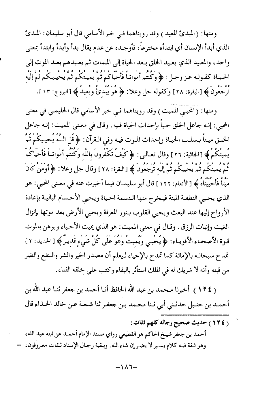 124 - أَخْبَرَنَا مُحَمَّدُ بْنُ عَبْدِ اللَّهِ الْحَافِظُ , أَنَا أَحْمَدُ بْنُ جَعْفَرٍ , ثنا عَبْدُ اللَّهِ بْنُ أَحْمَدَ بْنِ حَنْبَلٍ , حَدَّثَنِي أَبِي , ثنا مُحَمَّدُ بْنُ جَعْفَرٍ , ثنا شُعْبَةُ , عَنْ خَالِدٍ الْحَذَّاءِ , قَالَ: -[187]- سَمِعْتُ عَبْدَ اللَّهِ بْنَ الْحَرْثِ , يُحَدِّثُ عَنْ عَبْدِ اللَّهِ بْنِ عُمَرَ , رَضِيَ اللَّهُ عَنْهُمَا أَنَّهُ أَمَرَ رَجُلًا §إِذَا أَخَذَ مَضْجَعَهُ قَالَ: اللَّهُمَّ أَنْتَ خَلَقْتَ نَفْسِي وَأَنْتَ تَوَفَّاهَا , لَكَ مَحْيَاهَا وَمَمَاتُهَا إِنْ أَحْيَيْتَهَا فَاحْفَظْهَا بِمَا تَحْفَظُ بِهِ عِبَادَكَ الصَّالِحِينَ , وَإِنْ أَمَتَّهَا فَاغْفِرْ لَهَا , اللَّهُمَّ إِنِّي أَسْأَلُكُ الْعَافِيَةَ فَقَالَ لَهُ رَجُلٌ: أَسَمِعْتَ هَذَا مِنْ عُمَرَ رَضِيَ اللَّهُ عَنْهُ؟ قَالَ: مِنْ خَيْرٍ مِنْ عُمَرَ رَسُولَ اللَّهِ صَلَّى اللهُ عَلَيْهِ وَسَلَّمَ رَوَاهُ مُسْلِمٌ فِي الصَّحِيحِ عَنْ أَبِي بَكْرِ بْنِ نَافِعٍ وَغَيْرِهِ عَنْ مُحَمَّدِ بْنِ جَعْفَرٍ