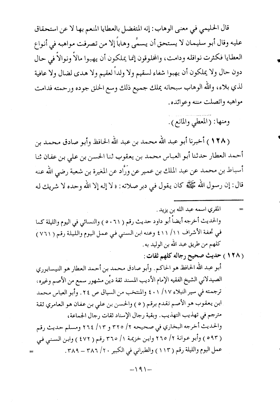 128 - أَخْبَرَنَا أَبُو عَبْدِ اللَّهِ مُحَمَّدُ بْنُ عَبْدِ اللَّهِ الْحَافِظُ وَأَبُو صَادِقٍ مُحَمَّدُ بْنُ أَحْمَدَ الْعَطَّارُ , حَدَّثَنَا أَبُو الْعَبَّاسِ مُحَمَّدُ بْنُ يَعْقُوبَ , ثنا الْحَسَنُ بْنُ عَلِيِّ بْنِ عَفَّانَ , ثنا أَسْبَاطُ بْنُ مُحَمَّدٍ , عَنْ عَبْدِ الْمَلِكِ بْنِ عُمَيْرٍ , عَنْ وَرَّادٍ , عَنِ الْمُغِيرَةِ بْنِ شُعْبَةَ , رَضِيَ اللَّهُ عَنْهُ قَالَ: إِنَّ رَسُولَ اللَّهِ صَلَّى اللهُ عَلَيْهِ وَسَلَّمَ كَانَ §يَقُولُ فِي دُبُرِ صَلَاتِهِ: «لَا إِلَهَ إِلَّا اللَّهُ وَحْدَهُ لَا شَرِيكَ لَهُ , -[192]- لَهُ الْمُلْكُ وَلَهُ الْحَمْدُ وَهُوَ عَلَى كُلِّ شَيْءٍ قَدِيرٌ اللَّهُمَّ لَا مَانِعَ لِمَا أَعْطَيْتَ وَلَا مُعْطِيَ لِمَا مَنَعْتَ وَلَا يَنْفَعُ ذَا الْجَدِّ مِنْكَ الْجَدُّ» أَخْرَجَاهُ فِي الصَّحِيحِ مِنْ حَدِيثِ عَبْدِ الْمَلِكِ بْنِ عُمَيْرٍ وَغَيْرِهِ قَالَ الْحَلِيمِيُّ: فَالْمُعْطِي هُوَ الْمُمَكِّنُ مِنْ نِعَمِهِ وَالْمَانِعُ هُوَ الْحَائِلُ دُونَ نِعَمِهِ , قَالَ: وَلَا يُدْعَى اللَّهُ عَزَّ وَجَلَّ بِاسْمِ الْمَانِعِ حَتَّى يُقَالُ مَعَهُ الْمُعْطِي كَمَا قُلْتُ فِي الضَّارِّ وَالنَّافِعِ , قَالَ أَبُو سُلَيْمَانَ: فَهُوَ يَمْلِكُ الْمَنْعَ وَالْعَطَاءَ وَلَيْسَ مَنْعُهُ بُخْلًا مِنْهُ , لَكِنَّ مَنْعَهُ حِكْمَةٌ وَعَطَاؤُهُ جُودٌ وَرَحْمَةٌ وَقِيلَ: الْمَانِعُ هُوَ النَّاصِرُ أَيِ الَّذِي يَمْنَعُ أَوْلِيَاءَهُ أَيْ يَحُوطُهُمْ وَيَنْصُرُهُمْ عَلَى عَدُوِّهِمْ وَيُقَالُ: فُلَانُ فِي مَنْعَةِ قَوْمِهِ أَيْ فِي جَمَاعَةٍ تَمْنَعُهُ وَتَحُوطُهُ , قُلْتُ وَعَلَى هَذَا الْمَعْنَى يَجُوزُ أَنْ يُدْعَى بِهِ دُونَ اسْمِ الْمُعْطِي وَقَدْ ذَكَرْنَا فِي خَبَرِ الْأَسَامِي الْمَانِعَ دُونَ اسْمِ الْمُعْطِي وَبَعْضُهُمْ قَالَ: الدَّافِعُ بَدَلَ الْمَانِعِ وَذَلِكَ يُؤَكِّدُ هَذَا الْمَعْنَى فِي الْمَانِعِ وَاللَّهُ أَعْلَمُ وَمِنْهَا «الْخَافِضُ وَالرَّافِعُ» وَهَذَانِ الِاسْمَانِ قَدْ ذَكَرْنَاهُمَا فِي خَبَرِ الْأَسَامِي , قَالَ الْحَلِيمِيُّ: وَلَا يَنْبَغِي أَنْ يُفْرَدَ الْخَافِضُ عَنِ الرَّافِعِ فِي الدُّعَاءِ فَالْخَافِضُ هُوَ الْوَاضِعُ مِنَ الْأَقْدَارِ , وَالرَّافِعُ الْمُعْلِي لِلْأَقْدَارِ