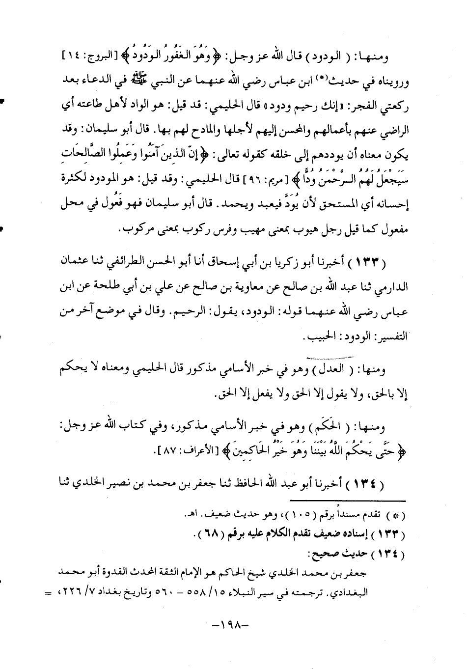 133 - أَخْبَرَنَا أَبُو زَكَرِيَّا بْنُ أَبِي إِسْحَاقَ , أنا أَبُو الْحَسَنِ الطَّرَائِفِيُّ , ثنا عُثْمَانُ الدَّارِمِيُّ , ثنا عَبْدُ اللَّهِ بْنُ صَالِحٍ , عَنْ مُعَاوِيَةَ بْنِ صَالِحٍ , عَنْ عَلِيِّ بْنِ أَبِي طَلْحَةَ , عَنِ ابْنِ عَبَّاسٍ , رَضِيَ اللَّهُ عَنْهُمَا قَوْلِهِ: §الْوَدُودُ , يَقُولُ: الرَّحِيمُ وَقَالَ فِي مَوْضِعٍ آخَرَ مِنَ التَّفْسِيرِ: الْوَدُودُ الْحَبِيبُ وَمِنْهَا «الْعَدْلُ» وَهُوَ فِي خَبَرِ الْأَسَامِي مَذْكُورٌ , قَالَ الْحَلِيمِيُّ وَمَعْنَاهُ لَا يَحْكُمُ إِلَّا بِالْحَقِّ , وَلَا يَقُولُ إِلَّا الْحَقَّ وَلَا يَفْعَلُ إِلَّا الْحَقَّ وَمِنْهَا «الْحَكَمُ» وَهُوَ فِي خَبَرِ الْأَسَامِي مَذْكُورٌ , وَفِي كِتَابِ اللَّهِ عَزَّ وَجَلَّ: {حَتَّى يَحْكُمَ اللَّهُ بَيْنَنَا وَهُوَ خَيْرُ الْحَاكِمِينَ} [الأعراف: 87]