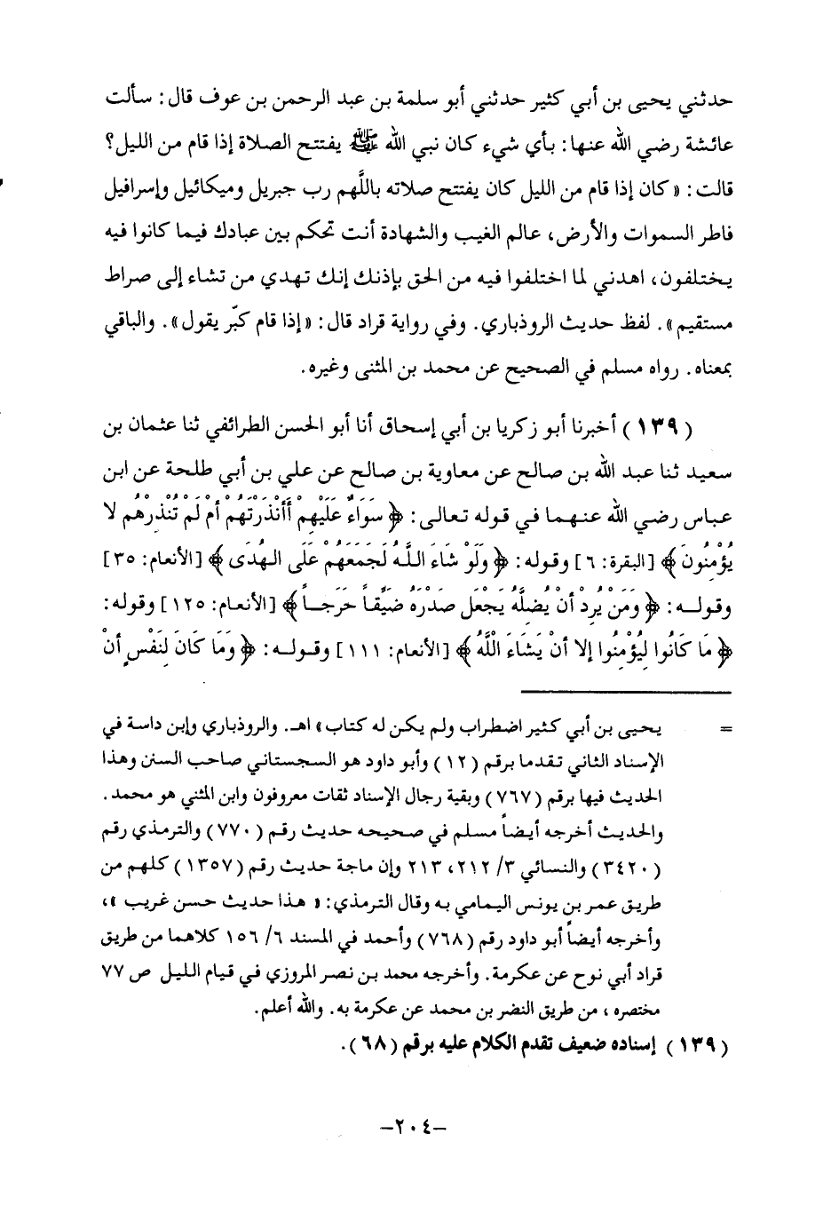 139 - أَخْبَرَنَا أَبُو زَكَرِيَّا بْنُ أَبِي إِسْحَاقَ , أنا أَبُو الْحَسَنِ الطَّرَائِفِيُّ , ثنا عُثْمَانُ بْنُ سَعِيدٍ , ثنا عَبْدُ اللَّهِ بْنُ صَالِحٍ , عَنْ مُعَاوِيَةَ بْنِ صَالِحٍ , عَنْ عَلِيِّ بْنِ أَبِي طَلْحَةَ , عَنِ ابْنِ عَبَّاسٍ , رَضِيَ اللَّهُ عَنْهُمَا فِي قَوْلِهِ تَعَالَى: {§سَوَاءٌ عَلَيْهِمْ أَأَنْذَرْتَهُمْ أَمْ لَمْ تُنْذِرْهُمْ لَا يُؤْمِنُونَ} [البقرة: 6] وَقَوْلِهِ: {وَلَوْ شَاءَ اللَّهُ لَجَمَعَهُمْ عَلَى الْهُدَى} [الأنعام: 35] وَقَوْلِهِ: {وَمَنْ يُرِدْ أَنْ يُضِلَّهُ يَجْعَلْ صَدْرَهُ ضَيِّقًا حَرَجًا} [الأنعام: 125] وَقَوْلِهِ: {مَا كَانُوا لِيُؤْمِنُوا إِلَّا أَنْ يَشَاءَ اللَّهُ} [الأنعام: 111] وَقَوْلِهِ {وَمَا كَانَ لِنَفْسٍ أَنْ -[205]- تُؤْمِنَ إِلَّا بِإِذْنِ اللَّهِ} [يونس: 100] وَقَوْلِهِ: {وَلَوْ شِئْنَا لَآتَيْنَا كُلَّ نَفْسٍ هُدَاهَا} [السجدة: 13] وَقَوْلِهِ: {وَلَوْ شَاءَ رَبُّكَ لَآمَنَ مَنْ فِي الْأَرْضِ كُلُّهُمْ جَمِيعًا} [يونس: 99] , وَقَوْلِهِ: {إِنَّا جَعَلْنَا فِي أَعْنَاقِهِمْ أَغْلَالًا} [يس: 8] وَقَوْلِهِ: {مَنْ أَغْفَلْنَا قَلْبَهُ عَنْ ذِكْرِنَا} [الكهف: 28] وَقَوْلِهِ: {إِنَّكَ لَا تُسْمِعُ الْمَوْتَى} [النمل: 80] وَقَوْلِهِ: {إِنَّكَ لَا تَهْدِي مَنْ أَحْبَبْتَ} [القصص: 56] وَقَوْلِهِ: {فَمِنْهُمْ شَقِيٌّ وَسَعِيدٌ} [هود: 105] وَنَحْوِ هَذَا مِنَ الْقُرْآنِ , قَالَ: إِنَّ رَسُولَ اللَّهِ صَلَّى اللهُ عَلَيْهِ وَسَلَّمَ كَانَ يَحْرِصُ أَنْ يُؤْمِنَ جَمِيعُ النَّاسِ وَيُبَايِعُوهُ عَلَى الْهُدَى , فَأَخْبَرَهُ اللَّهُ تَعَالَى أَنَّهُ لَا يُؤْمِنُ إِلَّا مَنْ سَبَقَتْ لَهُ مِنَ اللَّهِ السَّعَادَةُ فِي الذِّكْرِ الْأَوَّلِ وَلَا يَضِلُّ إِلَّا مَنْ سَبَقَتْ لَهُ مِنَ الْلَّهِ الشَّقَاوَةَ فِي الذِّكْرِ الْأَوَّلِ , ثُمَّ قَالَ لِنَبِيِّهِ صَلَّى اللهُ عَلَيْهِ وَسَلَّمَ: {لَعَلَّكَ بَاخِعٌ نَفْسَكَ أَلَّا يَكُونُوا مُؤْمِنِينَ إِنْ نَشَأْ نُنَزِّلْ عَلَيْهِمْ مِنَ السَّمَاءِ آيَةً فَظَلَّتْ أَعْنَاقُهُمْ لَهَا خَاضِعِينَ} [الشعراء: 4] وَقَالَ عَزَّ وَجَلَّ: {مَا يَفْتَحُ اللَّهُ لِلنَّاسِ مِنْ رَحْمَةٍ فَلَا مُمْسِكَ لَهَا وَمَا يُمْسِكُ فَلَا مُرْسِلَ لَهُ مِنْ بَعْدِهِ} [فاطر: 2] وَقَوْلِهِ: {لَيْسَ لَكَ مِنَ الْأَمْرِ شَيْءٌ} [آل عمران: 128] وَقَوْلِهِ: {وَلَوْ أَنَّنَا نَزَّلْنَا إِلَيْهِمُ الْمَلَائِكَةَ وَكَلَّمَهُمُ الْمَوْتَى وَحَشَرْنَا عَلَيْهِمْ كُلَّ شَيْءٍ قُبُلًا} [الأنعام: 111] يَعْنِي مُعَايَنَةً مَا كَانُوا لِيُؤْمِنُوا وَهُمْ أَهْلُ الشَّقَاءِ ثُمَّ قَالَ: {إِلَّا أَنْ يَشَاءَ اللَّهُ} [الأنعام: 111] وَهُمْ أَهْلُ السَّعَادَةِ الَّذِينَ سَبَقَ لَهُمْ فِي عِلْمِهِ أَنْ يَدْخُلُوا فِي الْإِيمَانِ , وَبِهَذَا الْإِسْنَادِ عَنِ ابْنِ عَبَّاسٍ رَضِيَ اللَّهُ عَنْهُمَا فِي قَوْلِهِ تَعَالَى: {أَعْطَى كُلَّ شَيْءٍ خَلْقَهُ ثُمَّ هَدَى} [طه: 50] يَقُولُ: خَلَقَ اللَّهُ لِكُلِّ شَيْءٍ رُوحَهُ ثُمَّ هَدَاهُ لِمَنْكَحِهِ وَمَطْعَمِهِ وَمَشْرَبِهِ وَمَسْكَنِهِ وَمَوْلِدِهِ وَمِنْهَا «الْحَنَّانُ» قَالَ الْحَلِيمِيُّ: وَهُوَ الْوَاسِعُ الرَّحْمَةِ , وَقَدْ يَكُونُ الْمَبَالِغُ فِي إِكْرَامِ أَهْلِ طَاعَتِهِ إِذَا وَافُوا دَارَ الْقَرَارِ , لِأَنَّ مَنْ حَنَّ مِنَ النَّاسِ إِلَى غَيْرِهِ أَكْرَمَهُ عِنْدَ لِقَائِهِ وَكُلِّفَ بِهِ عِنْدَ قُدُومِهِ قُلْتُ: وَهُوَ فِي خَبَرِ عَبْدِ الْعَزِيزِ بْنِ الْحُصَيْنِ مَذْكُورٌ