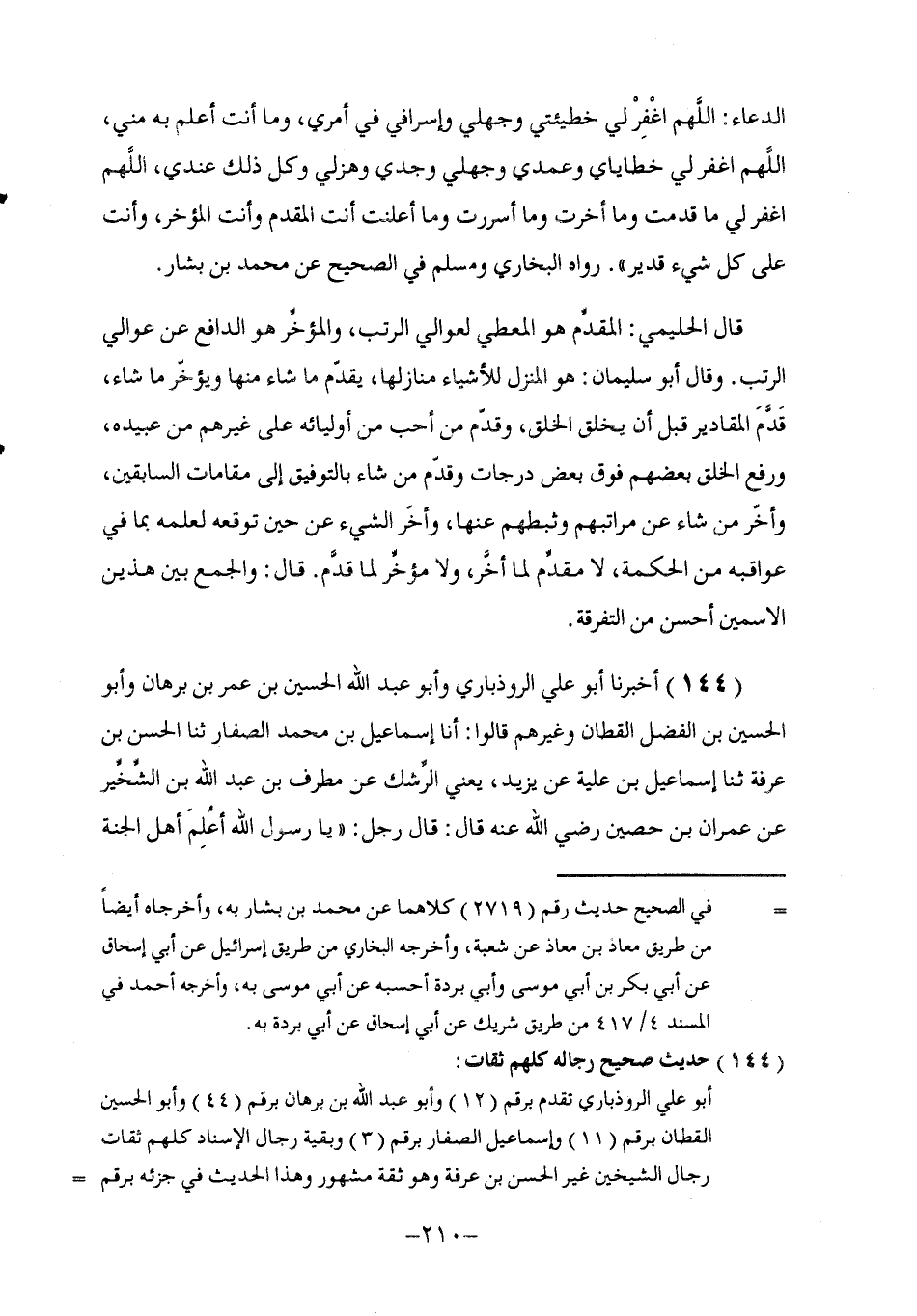 144 - أَخْبَرَنَا أَبُو عَلِيٍّ الرُّوذْبَارِيُّ , وَأَبُو عَبْدِ اللَّهِ الْحُسَيْنُ بْنُ عُمَرَ بْنِ بُرْهَانٍ , وَأَبُو الْحُسَيْنِ بْنُ الْفَضْلِ الْقَطَّانُ , وَغَيْرُهُمْ , قَالُوا: أنا إِسْمَاعِيلُ بْنُ مُحَمَّدٍ الصَّفَّارُ , ثنا الْحَسَنُ بْنُ عَرَفَةَ , ثنا إِسْمَاعِيلُ ابْنُ عُلَيَّةَ , عَنْ يَزِيدَ , يَعْنِي الرِّشْكَ , عَنْ مُطَرِّفِ بْنِ عَبْدِ اللَّهِ بْنِ الشِّخِّيرِ , عَنْ عِمْرَانَ بْنِ حُصَيْنٍ , رَضِيَ اللَّهُ عَنْهُ قَالَ: قَالَ رَجُلٌ: يَا رَسُولَ اللَّهِ أَعُلِمَ أَهْلُ الْجَنَّةِ -[211]- مِنْ أَهْلِ النَّارِ؟ , قَالَ صَلَّى اللهُ عَلَيْهِ وَسَلَّمَ: «نَعَمْ» , قَالَ: فَفِيمَ يَعْمَلُ الْعَامِلُونَ؟ , قَالَ صَلَّى اللهُ عَلَيْهِ وَسَلَّمَ: §«اعْمَلُوا فَكُلٌّ مُيَسَّرٌ لِمَا خُلِقَ لَهُ» أَوْ كَمَا قَالَ