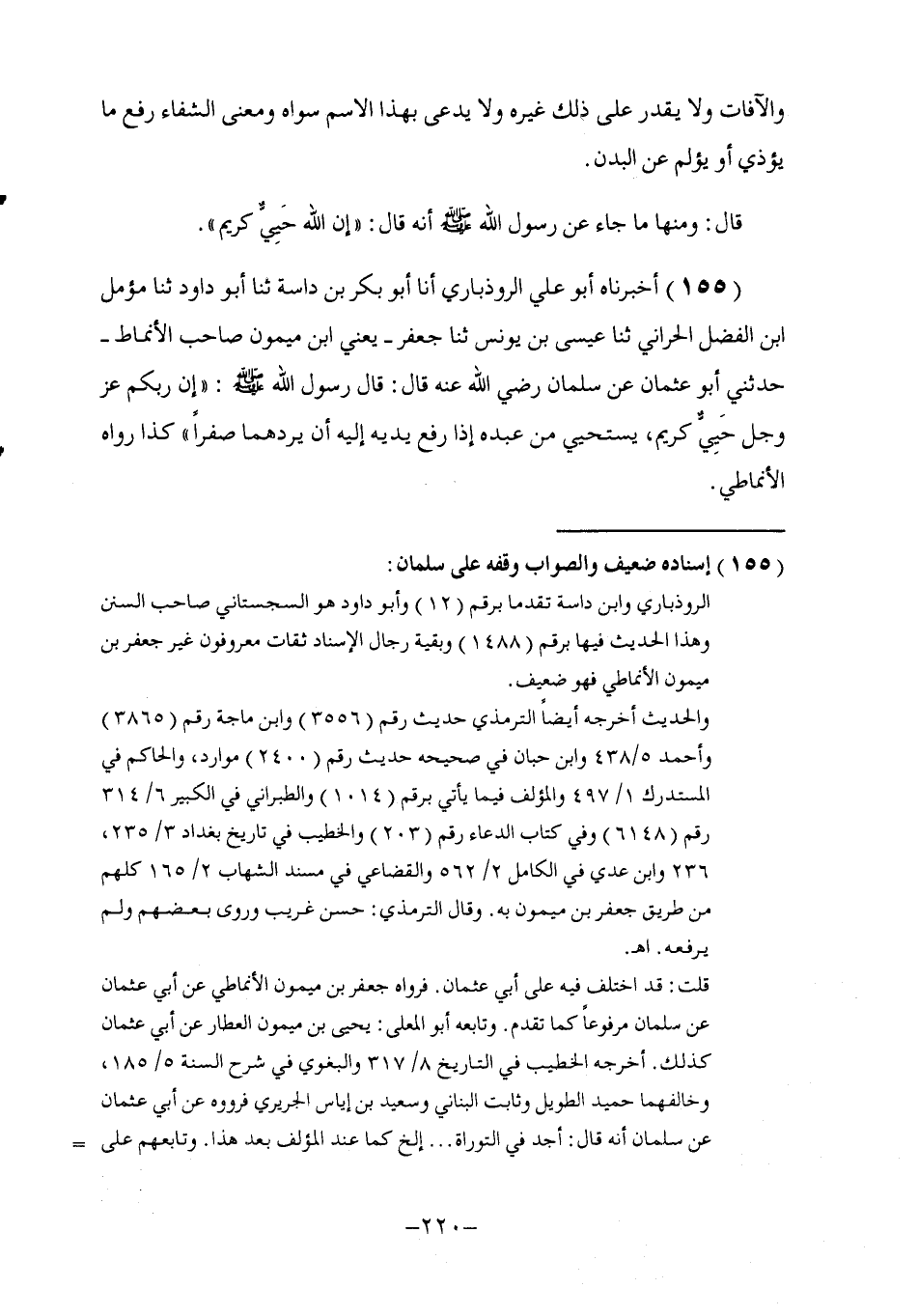 155 - أَخْبَرَنَاه أَبُو عَلِيٍّ الرُّوذْبَارِيُّ , أنا أَبُو بَكْرِ بْنُ دَاسَةَ , ثنا أَبُو دَاوُدَ , ثنا مُؤَمَّلُ بْنُ الْفَضْلِ الْحَرَّانِيُّ , ثنا عِيسَى بْنُ يُونُسَ , ثنا جَعْفَرٌ , يَعْنِي ابْنَ مَيْمُونٍ صَاحِبَ الْأَنْمَاطِ حَدَّثَنِي أَبُو عُثْمَانَ , عَنْ سَلْمَانَ , رَضِيَ اللَّهُ عَنْهُ قَالَ: قَالَ رَسُولُ اللَّهِ صَلَّى اللهُ عَلَيْهِ وَسَلَّمَ: §«إِنَّ رَبَّكُمْ عَزَّ وَجَلَّ حَيِيٌّ كَرِيمٌ , يَسْتَحْيِي مِنْ عَبْدِهِ إِذَا رَفَعَ يَدَيْهِ إِلَيْهِ أَنْ يَرُدَّهُمَا صِفْرًا» كَذَا رَوَاهُ الْأَنْمَاطِيُّ