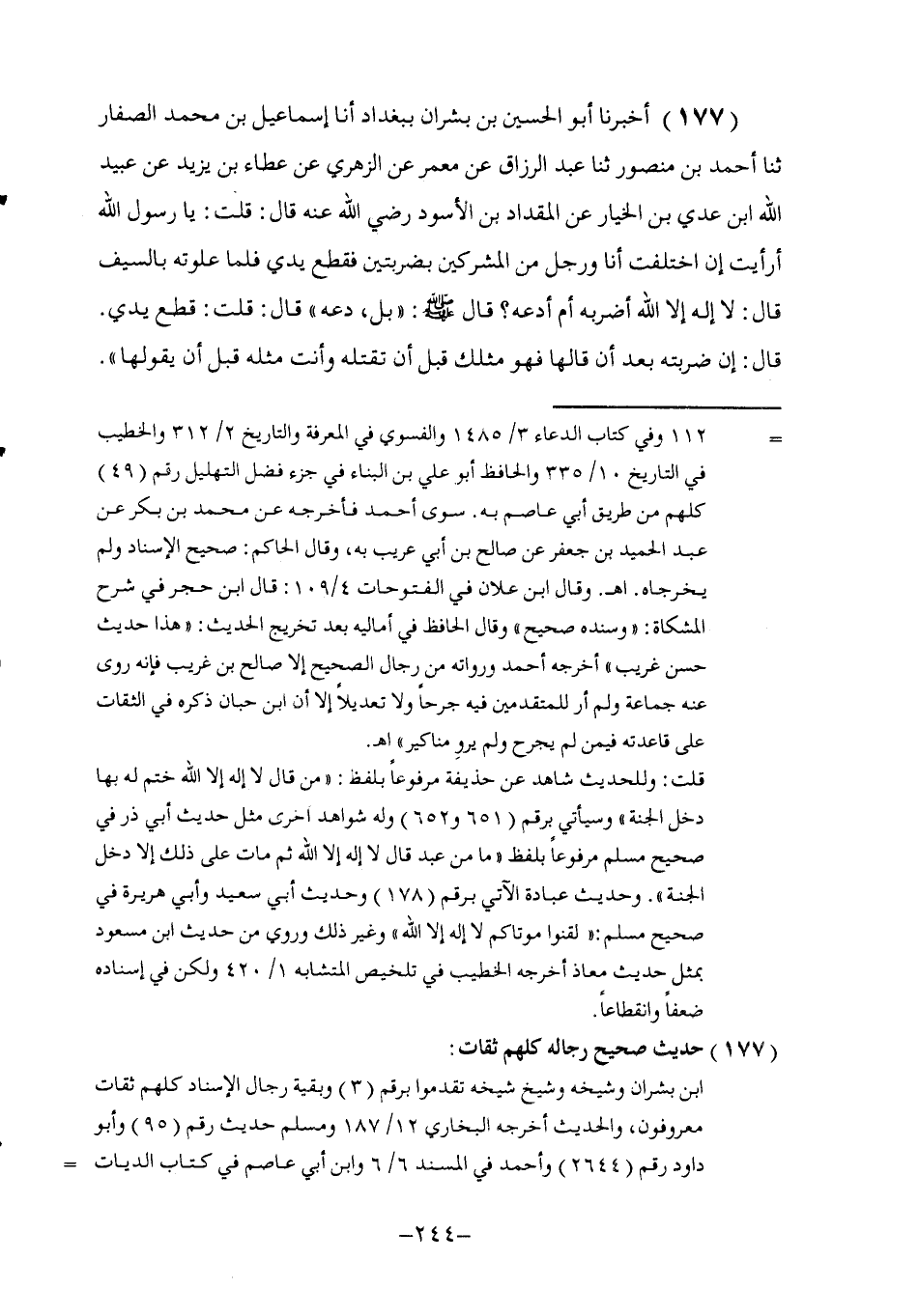 177 - أَخْبَرَنَا أَبُو الْحُسَيْنِ بْنُ بِشْرَانَ , بِبَغْدَادَ , أنا إِسْمَاعِيلُ بْنُ مُحَمَّدٍ الصَّفَّارُ , ثنا أَحْمَدُ بْنُ مَنْصُورٍ , ثنا عَبْدُ الرَّزَّاقِ , عَنْ مَعْمَرٍ , عَنِ الزُّهْرِيِّ , عَنْ عَطَاءِ بْنِ يَزِيدَ , عَنْ عُبَيْدِ اللَّهِ بْنِ عَدِيِّ بْنِ الْخِيَارِ , عَنِ الْمِقْدَادِ بْنِ الْأَسْوَدِ , رَضِيَ اللَّهُ عَنْهُ قَالَ: قُلْتُ يَا رَسُولَ اللَّهِ أَرَأَيْتَ إِنِ اخْتَلَفْتُ أَنَا وَرَجُلٌ مِنَ الْمُشْرِكِينَ بِضَرْبَتَيْنِ فَقَطَعَ يَدِي فَلَمَّا عَلَوْتُهُ بِالسَّيْفِ §قَالَ: لَا إِلَهَ إِلَّا اللَّهُ أَضْرِبُهُ أَمْ أَدَعُهُ؟ قَالَ صَلَّى اللهُ عَلَيْهِ وَسَلَّمَ: «بَلْ دَعْهُ» قَالَ: قُلْتُ: قَطَعَ يَدِي قَالَ: «إِنْ ضَرَبْتَهُ بَعْدَ أَنْ قَالَهَا فَهُوَ مِثْلُكَ قَبْلَ أَنْ تَقْتُلَهُ وَأَنْتَ مِثْلُهُ قَبْلَ أَنْ يَقُولَهَا» -[245]- قُلْتُ: يُرِيدُ بِهِ فِي إِبَاحَةِ الدَّمِ رَوَاهُ مُسْلِمٌ فِي الصَّحِيحِ عَنِ إِسْحَاقَ بْنِ إِبْرَاهِيمَ عَنْ عَبْدِ الرَّزَّاقِ