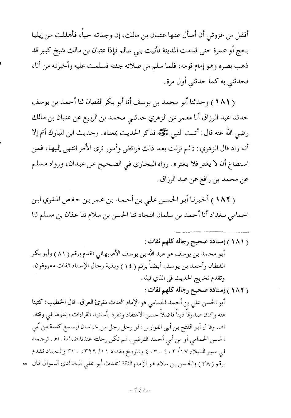 182 - أَخْبَرَنَا أَبُو الْحَسَنِ عَلِيُّ بْنُ أَحْمَدَ بْنِ عُمَرَ بْنِ حَفْصٍ الْمُقْرِئُ ابْنُ الْحَمَامِيِّ بِبَغْدَادَ , أنا أَحْمَدُ بْنُ سَلْمَانَ النِّجَادُ , ثنا الْحَسَنُ بْنُ سَلَّامٍ , ثنا عَفَّانُ بْنُ مُسْلِمٍ , ثنا -[249]- حَمَّادُ بْنُ سَلَمَةَ , ثنا ثَابِتٌ , عَنْ أَنَسٍ , عَنْ مَحْمُودِ بْنِ الرَّبِيعِ , عَنْ عِتْبَانَ بْنِ مَالِكٍ , رَضِيَ اللَّهُ عَنْهُ - وَكَانَ أَعْمَى - قَالَ: يَا رَسُولَ اللَّهِ تَعَالَ فَخُطَّ فِي دَارِي خَطًّا حَتَّى أَتَّخِذَهُ مُصَلًّى وَمَسْجِدًا , فَاجْتَمَعَ إِلَيْهِ قَوْمُهُ وَتَغَيَّبَ مَالِكُ بْنُ الدُّخْشُمِ فَوَقَعُوا فِيهِ , وَقَالُوا: يَا رَسُولَ اللَّهِ إِنَّهُ مُنَافِقٌ , فَقَالَ رَسُولُ اللَّهِ صَلَّى اللهُ عَلَيْهِ وَسَلَّمَ: §«أَلَيْسَ يَشْهَدُ أَنْ لَا إِلَهَ إِلَّا اللَّهُ وَأَنِّي رَسُولُ اللَّهِ؟» قَالُوا: بَلَى يَا رَسُولَ اللَّهِ إِنَّمَا يَقُولُهَا تَعَوُّذًا , قَالَ صَلَّى اللهُ عَلَيْهِ وَسَلَّمَ: «فَوَالَّذِي نَفْسِي بِيَدِهِ لَا يَقُولُهَا عَبْدٌ صَادِقًا إِلَّا حُرِّمَتْ عَلَيْهِ النَّارُ» قَالَ أَنَسٌ رَضِيَ اللَّهُ عَنْهُ: فَلَقِيتُ عِتْبَانَ رَضِيَ اللَّهُ عَنْهُ فَسَأَلْتُهُ فَحَدَّثَنِي أَخْرَجَهُ مُسْلِمٌ فِي الصَّحِيحِ مِنْ وَجْهٍ آخَرَ عَنْ حَمَّادِ بْنِ سَلَمَةَ